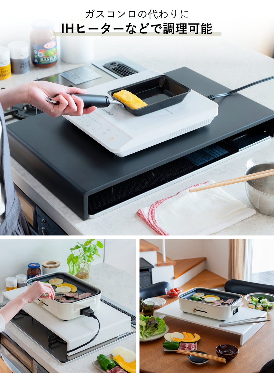 火を使うのが心配な環境でも、コンロカバーの上にIHヒーターを設置すれば電気調理が可能です。IHヒーターのほか、さまざまな電気調理器具の設置にも対応します。