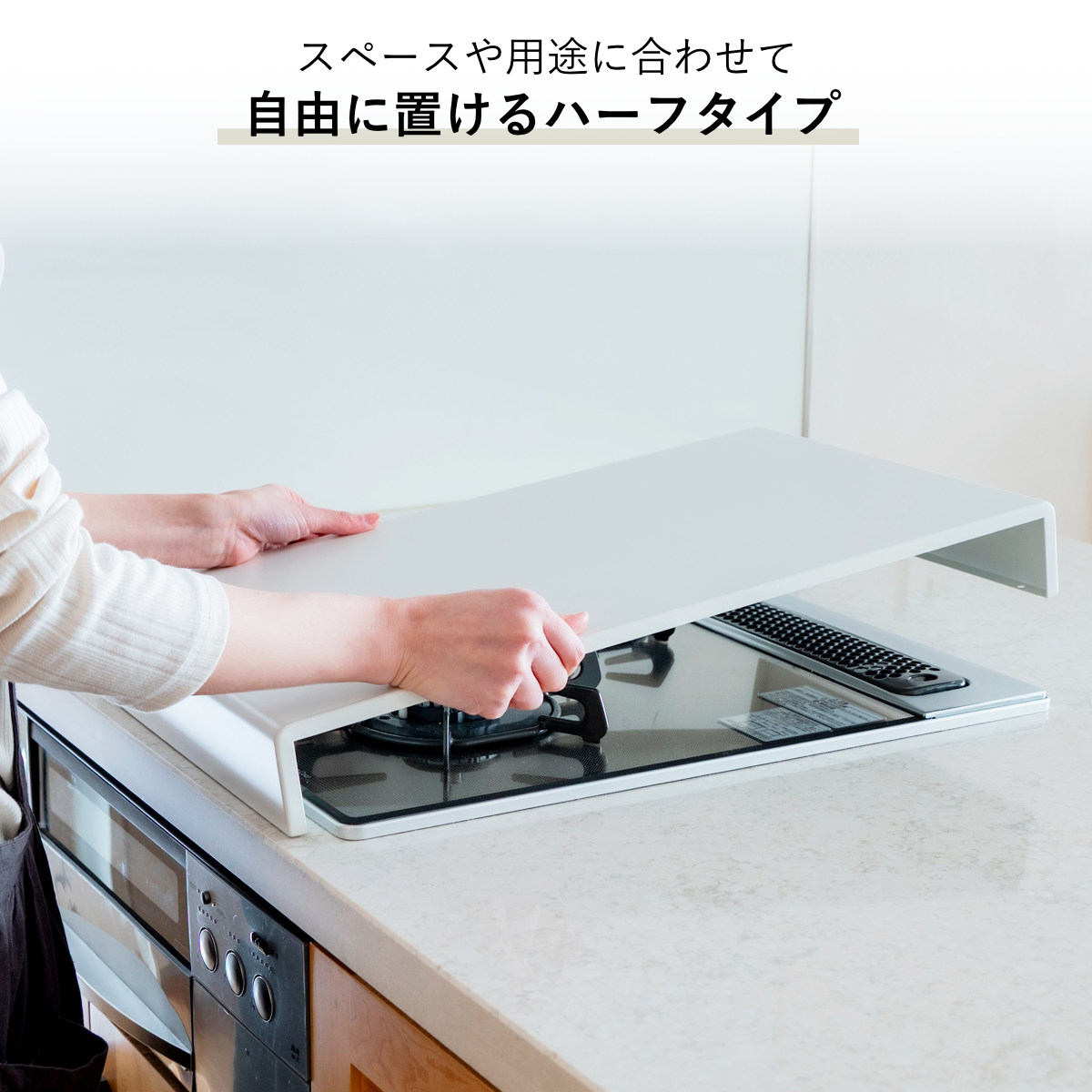 置き方を選ばず、キッチンのスペースや用途に合わせて使えるハーフタイプ。工具不要で、置くだけの簡単設置も嬉しいポイントです。コンパクトなキッチンや一人暮らしにもおすすめ。