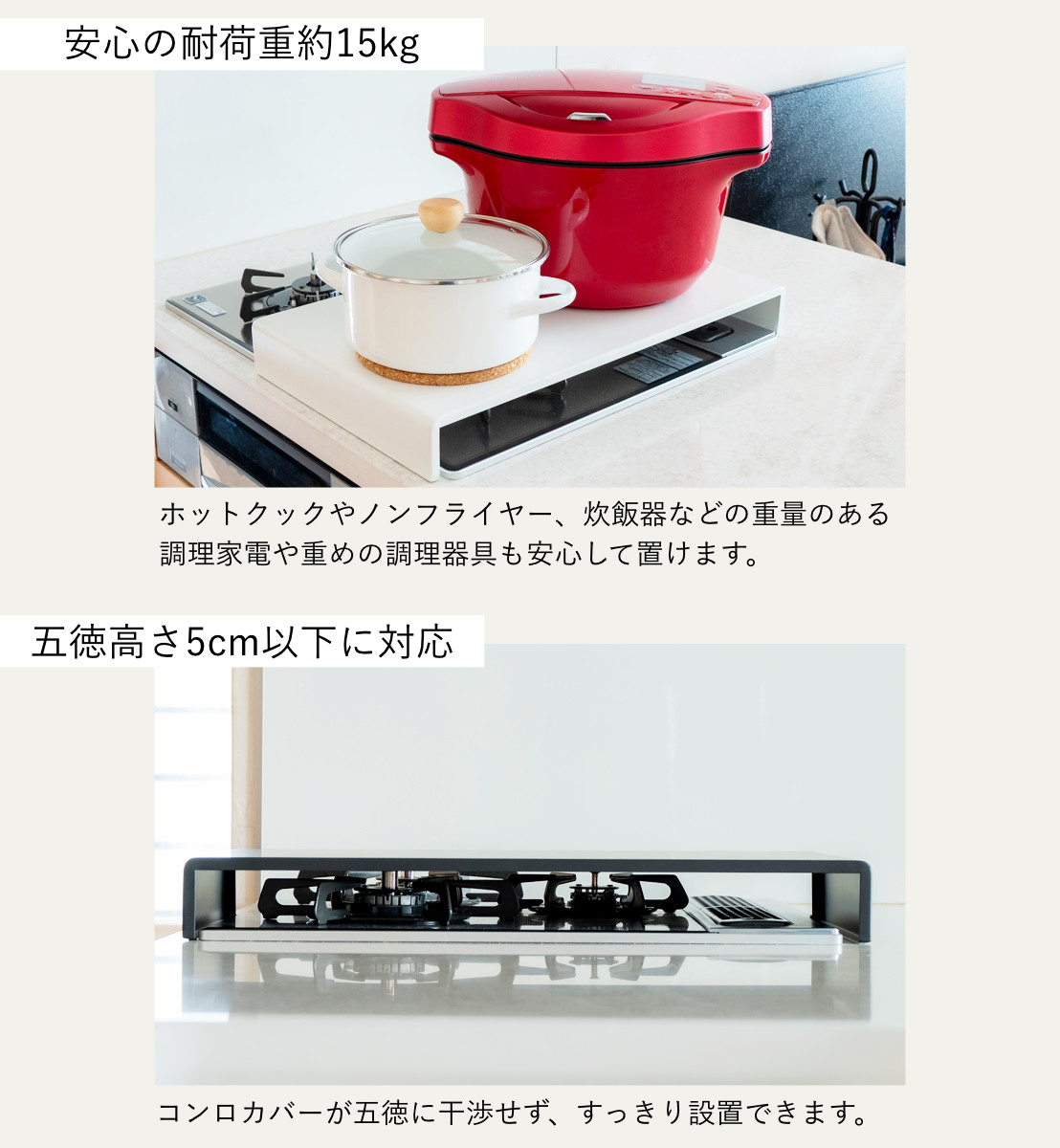 | 注意事項 | ※熱い鍋ややかん等を直接のせないでください。変色・変形の恐れがあります。 ※コンロ使用直後の熱い状態で製品を設置したり、設置したままコンロを使用しないでください。 |