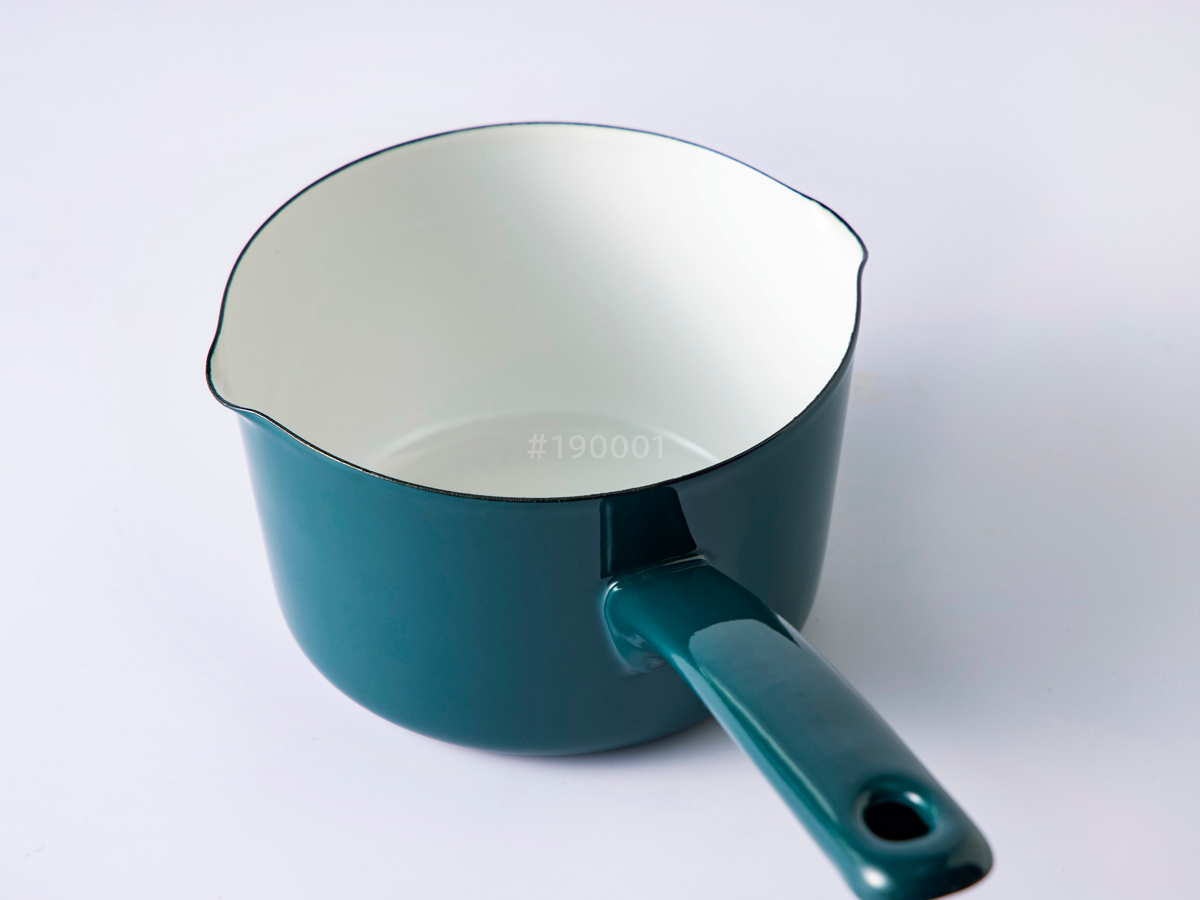 ※ホーロー製品は手作業で釉薬(ゆうやく)をかけるため、縁や裏側に塗りムラが起こります。また、焼成の際に吊るして炉に入れるため、縁や取っ手の裏側に金具の跡が残る場合があります。