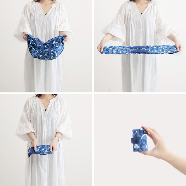 たたむのが面倒なエコバッグも、両端を引っぱると一気に帯状になり、2回半分に折って丸めるだけで簡単にたたむことが出来ます。