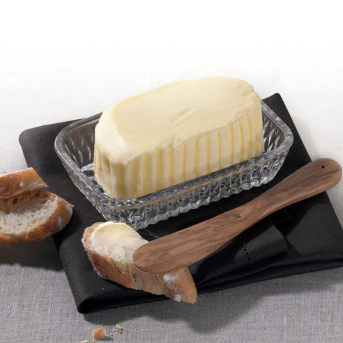 透明なガラス素材なので中身が一目でわかり、使い勝手も良好です。冷蔵庫での保存はもちろん、そのまま食卓に出しても様になるシンプルなデザイン。バターケースとしてだけでなく、チーズや小さな食材の保存容器としても活躍します。