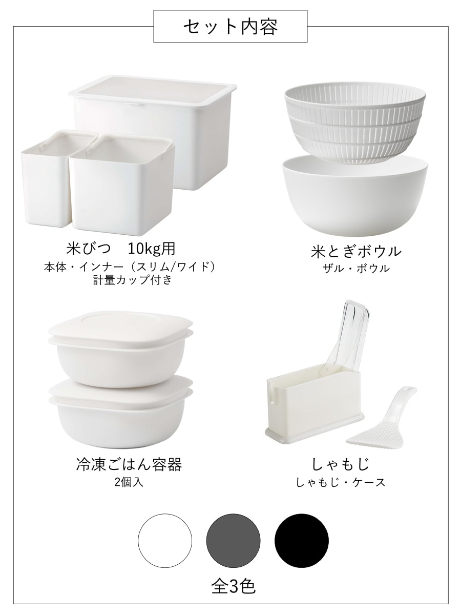 | 内容量 | 【セット内容】 米びつ×1セット(本体・インナーワイド・インナースリム・計量カップ) 米とぎボウル×1セット(ザル・ボウル) 冷凍ごはん容器×2個 しゃもじ・ケース×1個 |