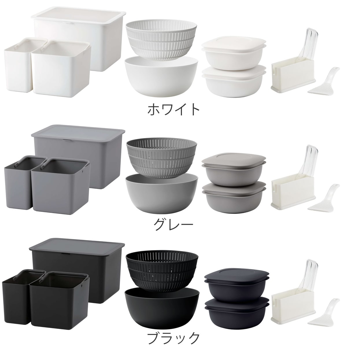 ![]() 米びつ | ![]() 米とぎボウル | ![]() 冷凍ごはん容器 |