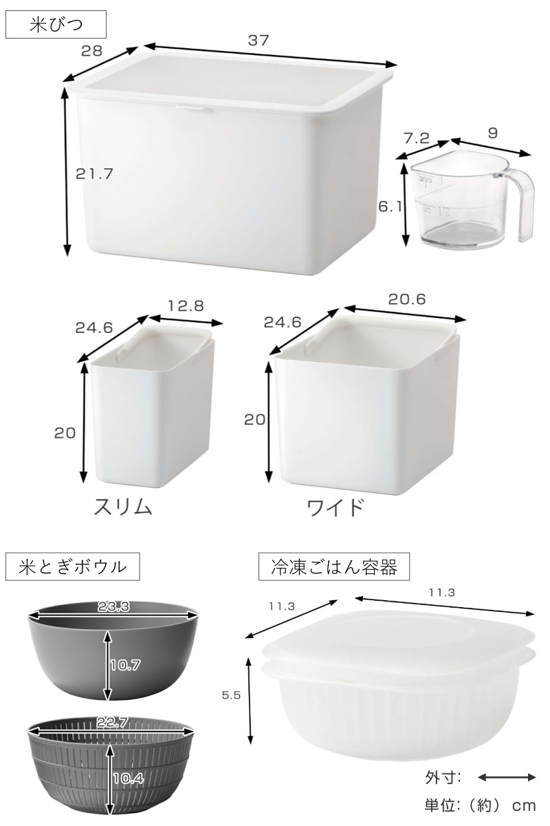 | サイズ | 【米びつ】 ・外寸 本体:約 幅37×奥行28×高さ21.7(cm) インナーワイド:約 幅20.6×奥行24.6×高さ20(cm) インナースリム:約 幅12.8×奥行24.6×高さ20(cm) 計量カップ:約 幅7.2×奥行9×高さ6.1(cm) ・内寸 本体:約 幅29.9×奥行20.9×高さ20.9(cm) インナーワイド:約 幅16.7×奥行20.8×高さ18(cm) インナースリム:約 幅9.1×奥行20.8×高さ18(cm) 【米とぎボウル】 ザル:約 直径22.7×高さ10.4(cm) ボウル:約 直径23.3×高さ10.7(cm) 【冷凍ごはん容器】 約 幅11.3×奥行11.3×高さ5.5(cm) 【しゃもじ】 約 幅13.5×奥行5.2×高さ9(cm) |