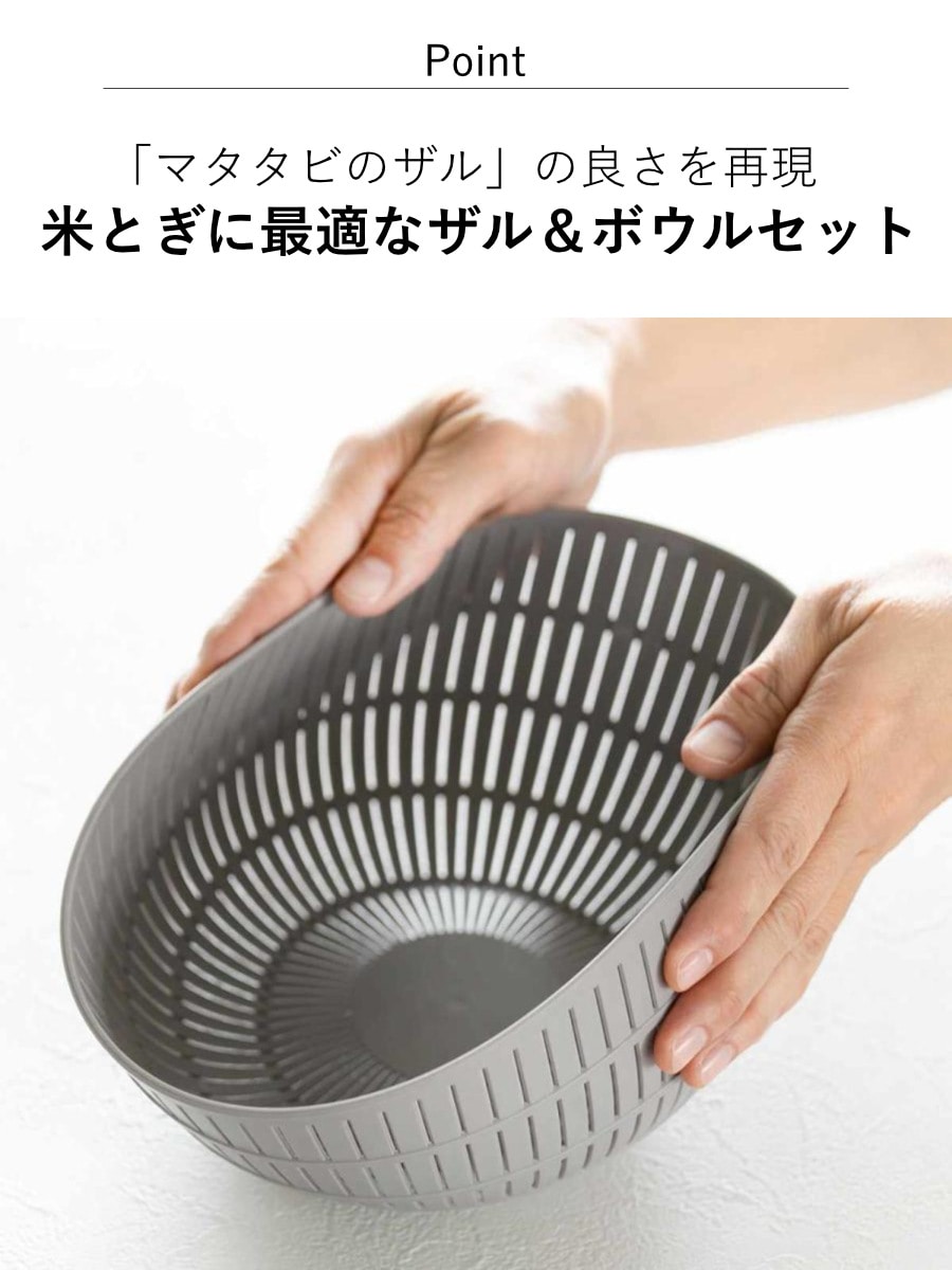 日本で古くから使われている「マタタビのザル」の弾力性と水切れの良さを樹脂製品で再現しました。金属製のザルに比べてお米が傷つかず、一粒一粒がふっくらとした炊きあがりになります。