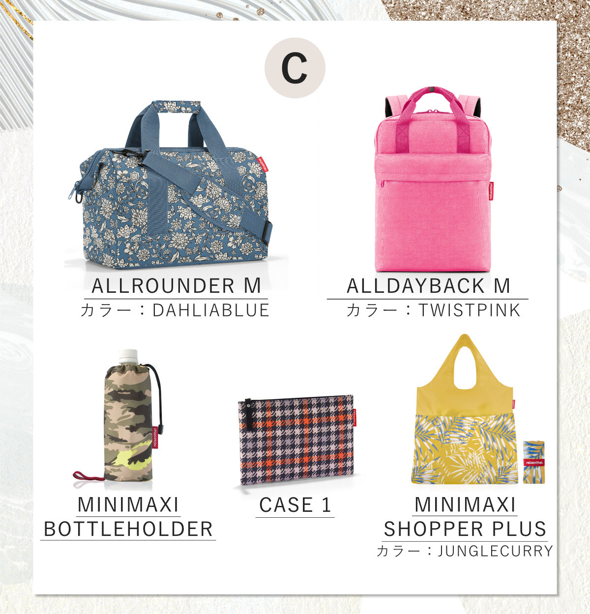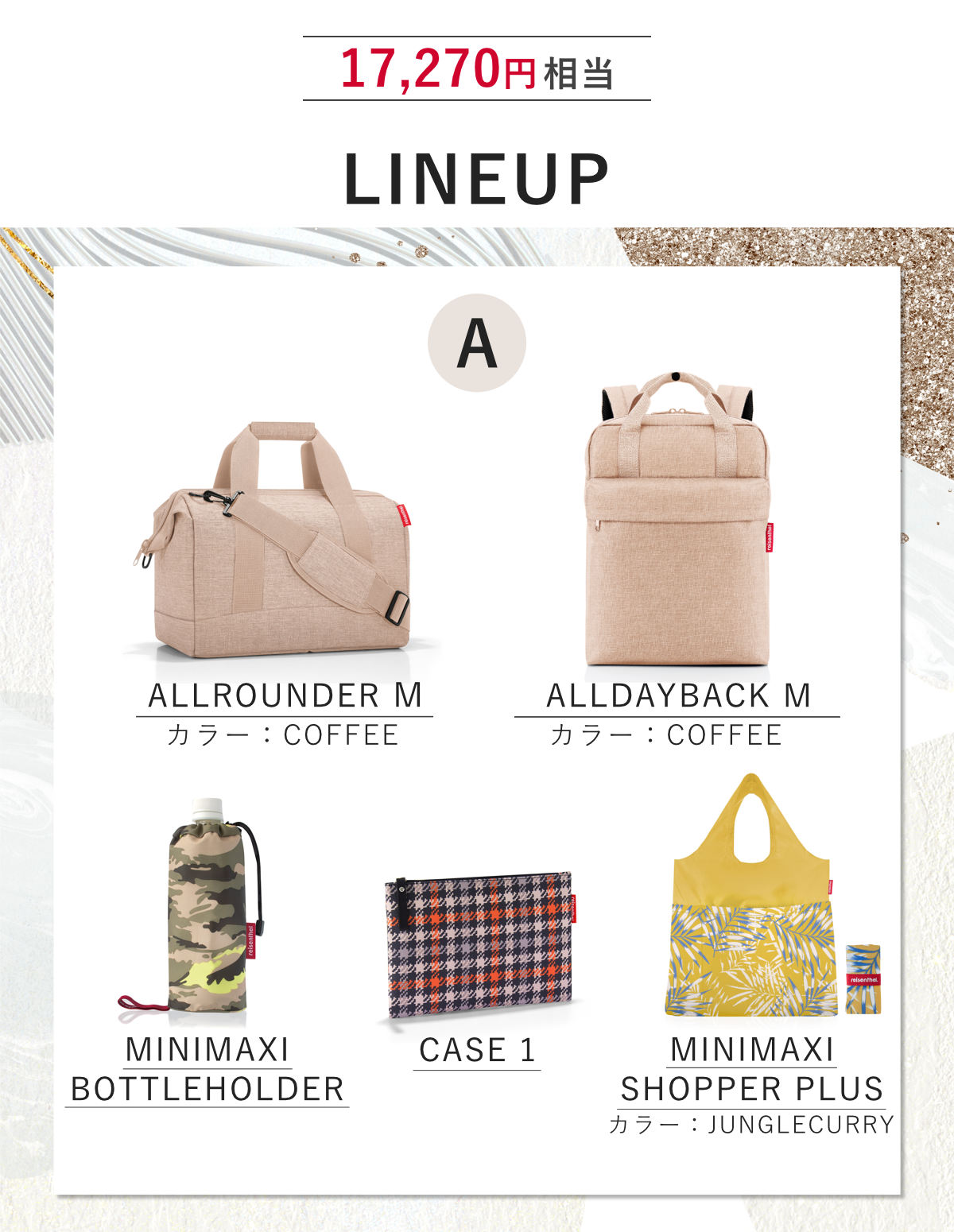 | 内容量 | ボストンバッグ、ボトルホルダー、ポーチ、エコバッグ、リュック:各1個 |