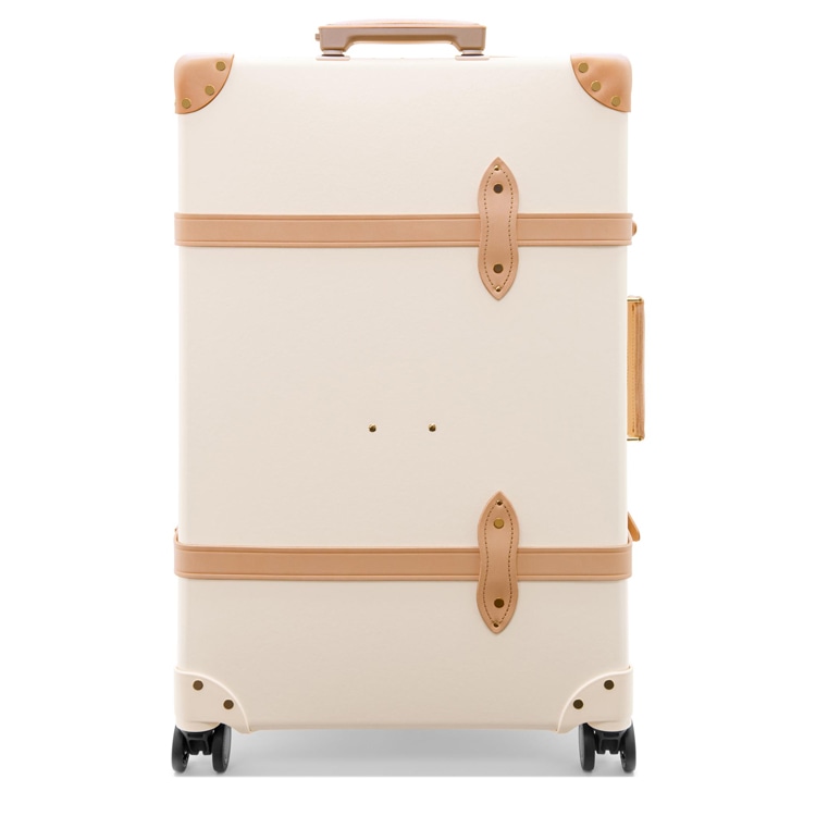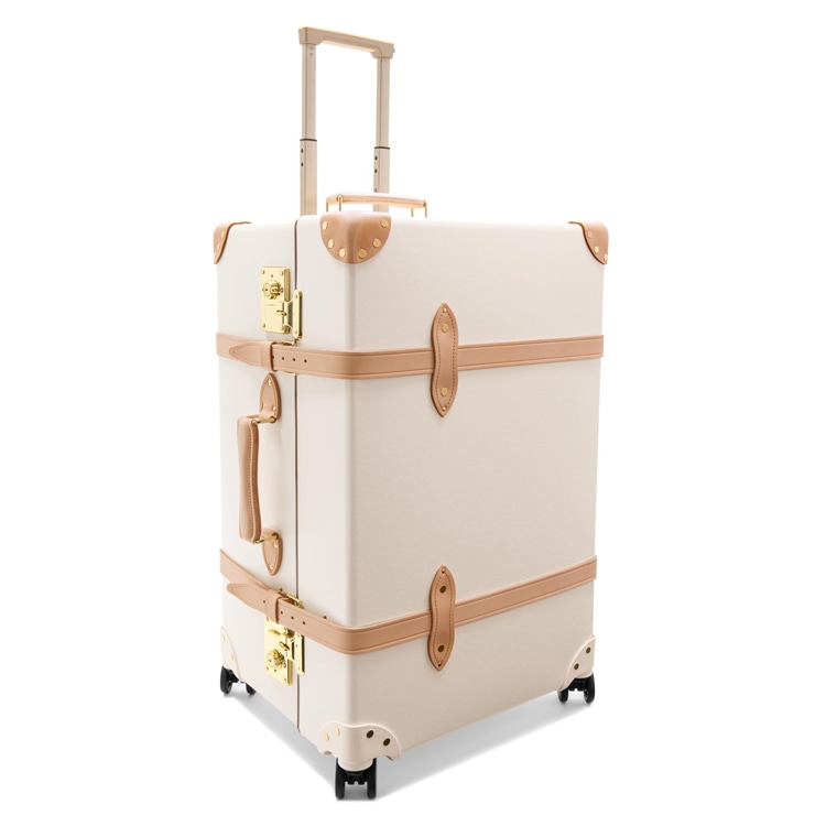 グローブ・トロッターを代表する「サファリ」コレクションのXLトランク。クラシックなアイボリーのボディに、ナチュラルレザーのコーナーをあしらった上品なデザインが魅力です。ブランドを象徴する最大サイズのトランクで、長期旅行にも最適。軽量ながら堅牢なバルカナイズドファイバーボードのボディに、4輪キャスターと伸縮式トロリーハンドルを備え、快適な移動をサポートします。