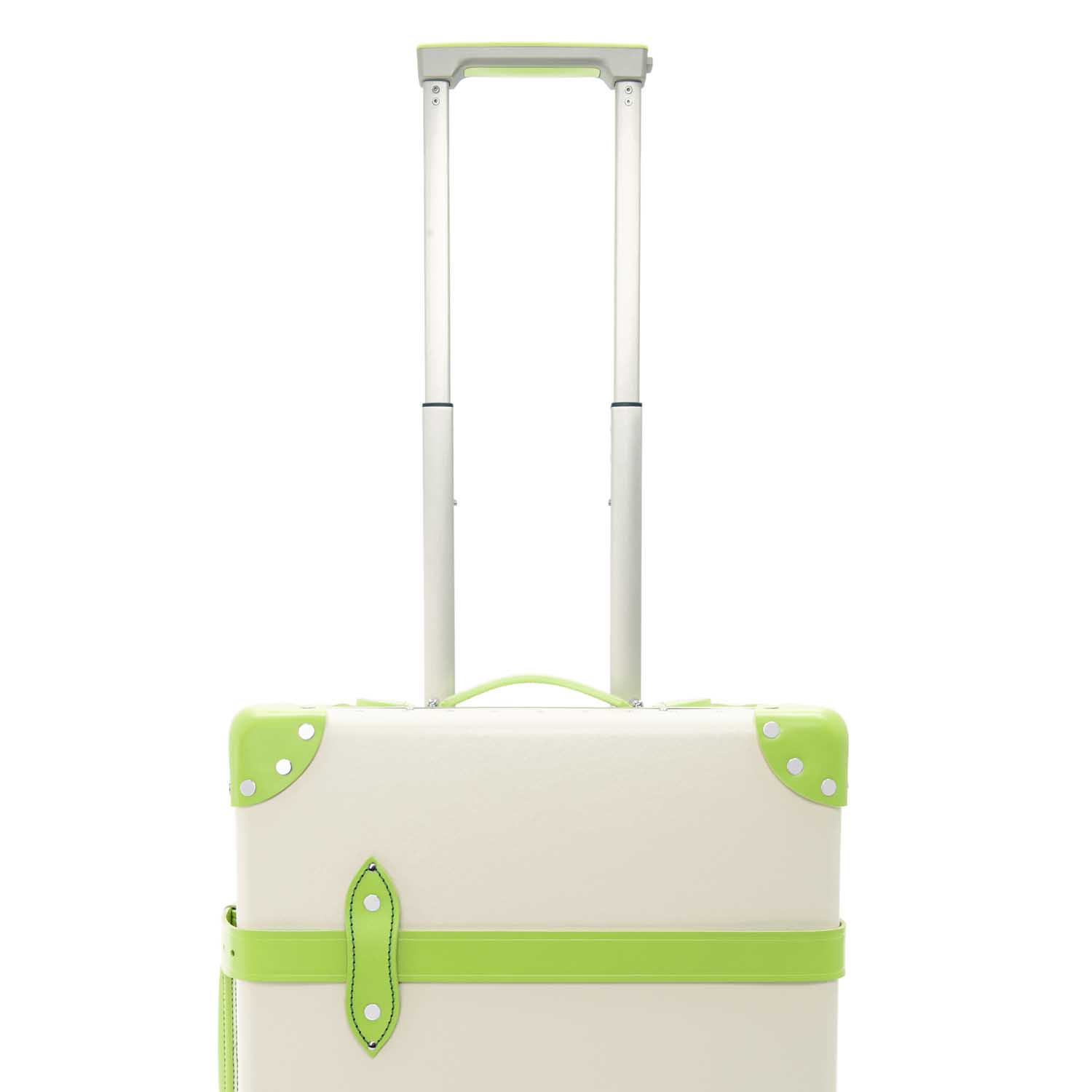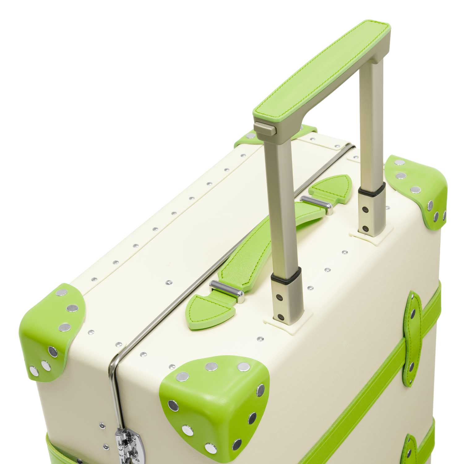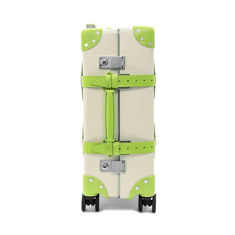 アイボリー色のヴァルカン・ファイバーのボディに、青々とした緑の風景を想起させる「パロットグリーン」のレザーのディテールがアクセント。