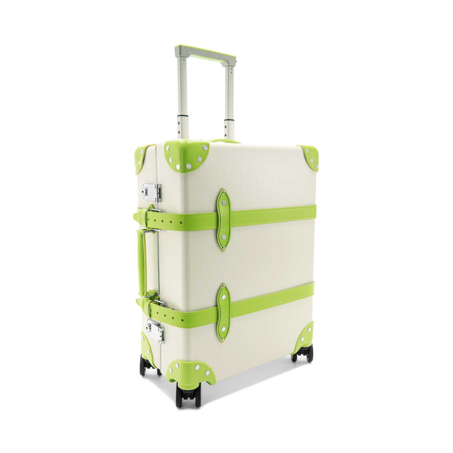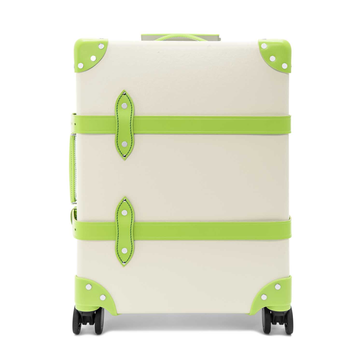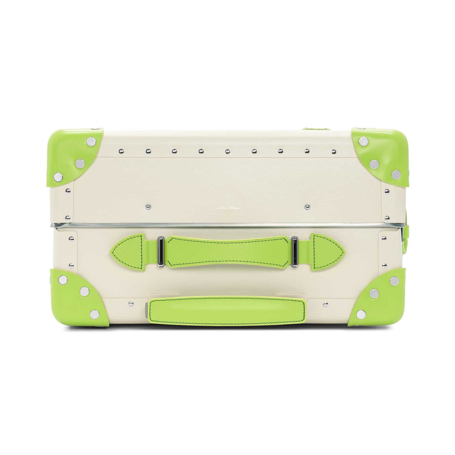 アイボリー色のヴァルカン・ファイバーのボディに、青々とした緑の風景を想起させる「パロットグリーン」のレザーのディテールがアクセント。
