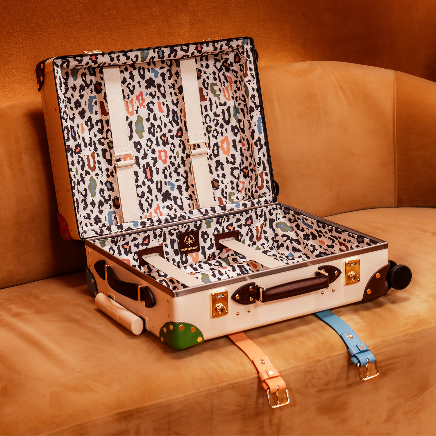 内装は、GOLF le FLEUR*を象徴するマルチカラーのレオパード。ベルボーイ・アイコンのエンボス加工が施されたラゲッジタグが付属します。