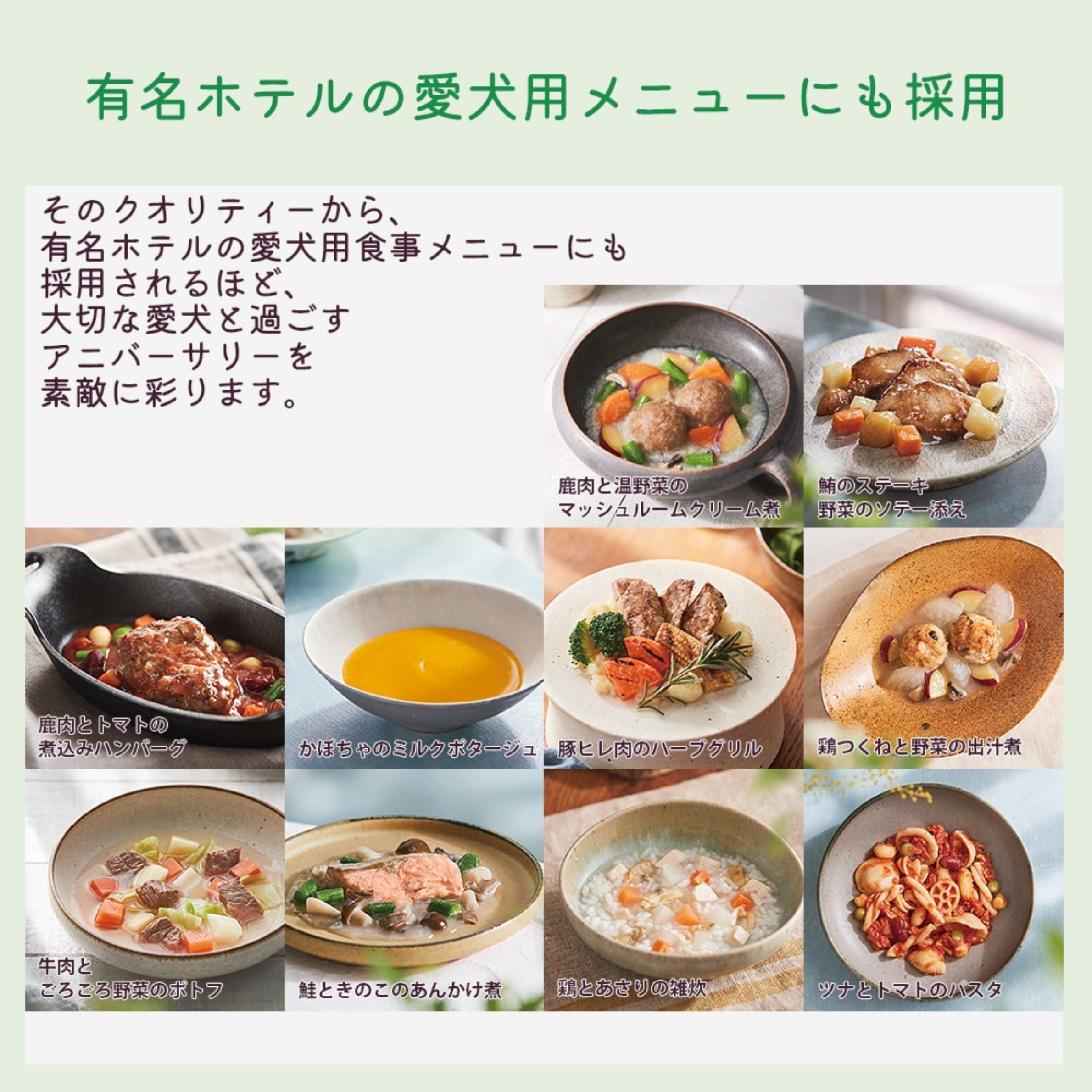 人の料理と向き合い、作り続けてきたシェフだからこそ、 品位高く、彩り豊かなお惣菜に仕上がりました。【食事からの水分補給に】最近は食材や食感を考慮しながら、愛犬の食事を手作りしている飼い主様が増えてきました。しかし市販のおやつは乾燥品が多く、外出時に水分補給がうまくできないこともあります。本品は食事としてはもちろん、外出時の水分補給にもご活用いただけます。