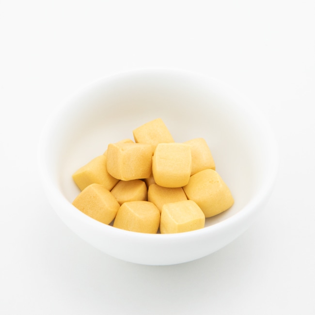 生地が層をなしたキューブ型のクッキーは、歯が少し当たるだけで簡単に食べられます。手で楽に割ることができるので、口の小さな子には細かく砕いて与えてみてください。適度な噛みごたえもあり、早食いにならず、時間をかけて楽しんでくれますよ。また、ユーグレナが入っており、おやつでありながら栄養面に配慮できるのもうれしいですね。