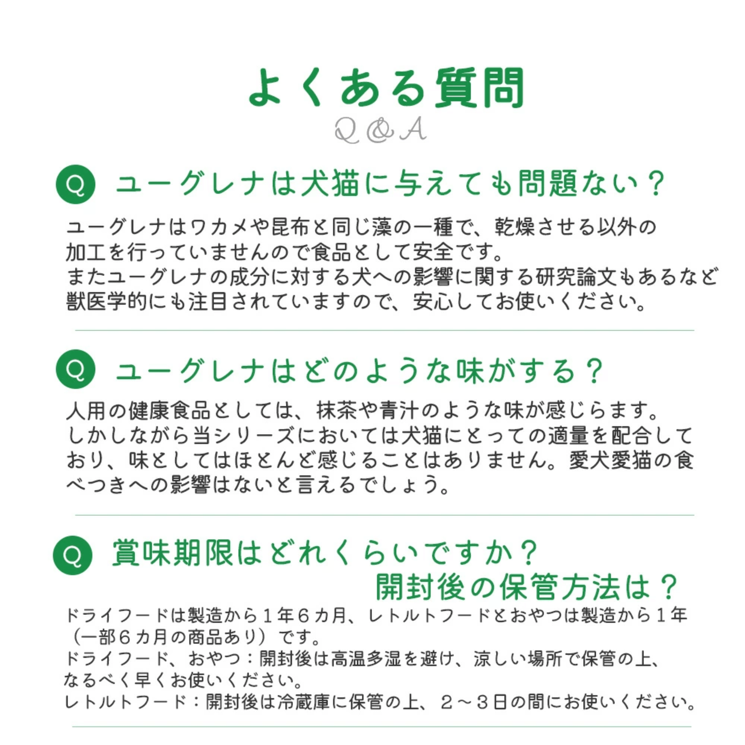 愛犬にいつまでもおいしく食べてもらえて健康に過ごしてもらえるよう、59種類の栄養素が含まれた話題のユーグレナ(和名:ミドリムシ)を配合したオリジナルフードや、お惣菜・おやつを販売。動物たちの健康をサポートし、地域への貢献を目指して運営している獣医師団体「葉月会」が推奨しています。