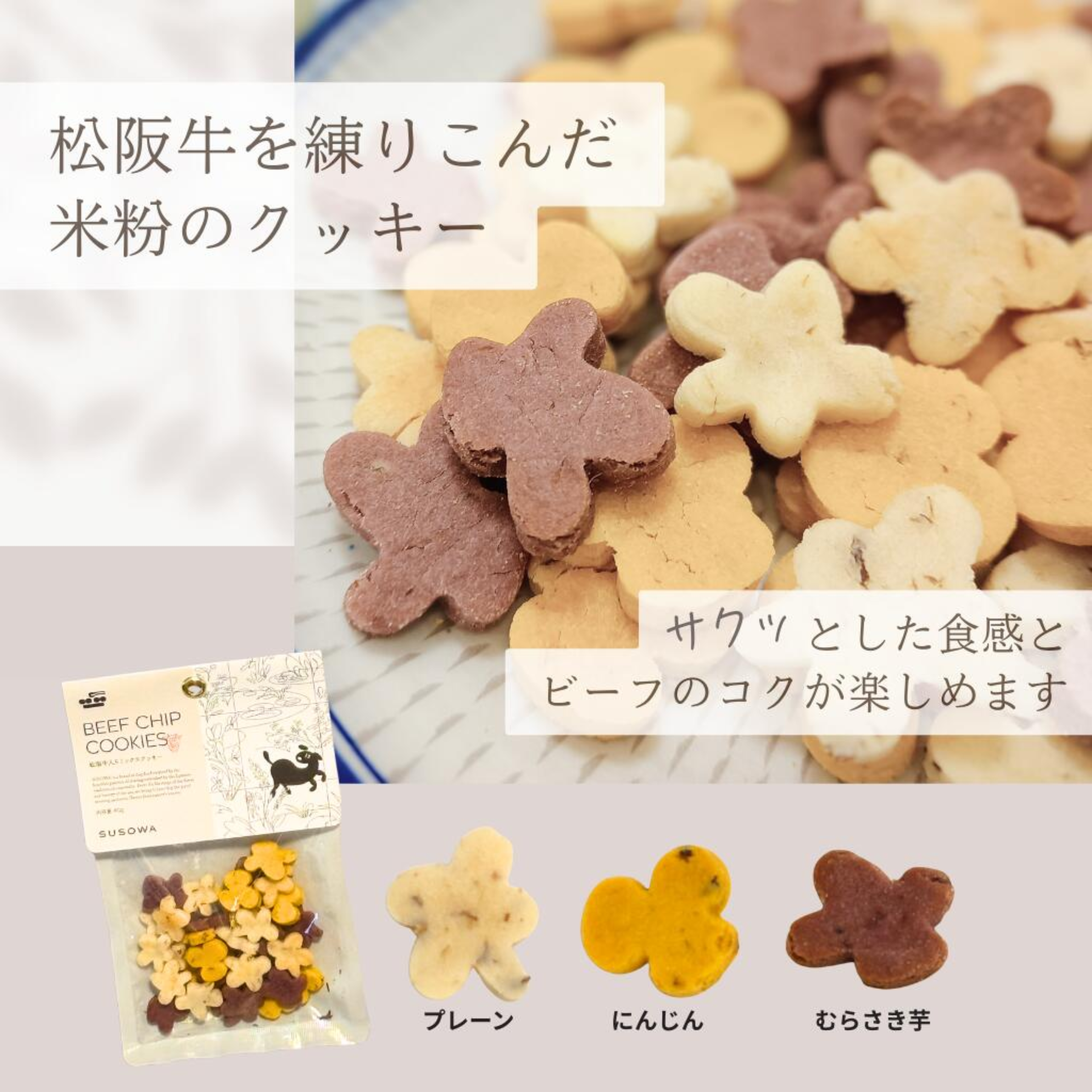 松阪牛専門店の目利きが光る厳選松阪牛を素材で使用。 ひとつひとつ丁寧に型抜きし焼き上げました。 封を開けると豊かな肉の香りが広がり、食欲をそそります。 サクカリ食感と松阪牛のうまみで、愛犬も大喜びです。