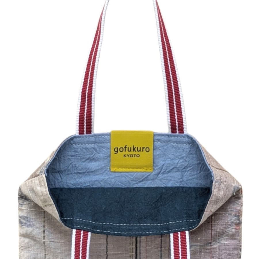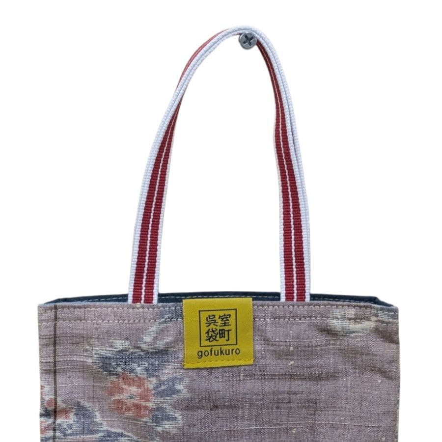 室町呉袋のミニトートバッグは、ヴィンテージの着物反物の幅(約35-38cm)のちょうど半分の幅でお作りしたバッグです。今では珍しくもある、ヴィンテージの着物反物のユニークで美しい柄を最大限引き出せるよう、底面にマチを作らず平面で1枚1枚丁寧に縫製しています。 また、リバーシブルでご使用いただけます。