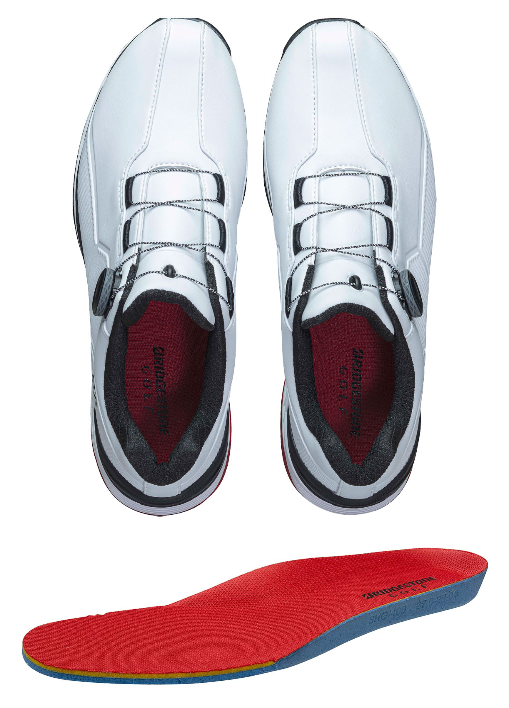 前モデル(SHG380)対比 "足幅"を広げ、圧迫感のない“よりゆったりとした履き心地”にこだわったモデルです。 上層(柔らかめ)と下層(硬め)の硬度を変えた新設計「2重構造ミッドソール」と、踵部の「TPU製ヒールカウンター」により、クッション性と安定性を確保しています。さらに、インソールは「ゼロ・スパイク バイター ツアー(SH2401) 」で好評のクッション性の高い「2層インソール」を使用することで、高いクッション性を追求しました。 グリップ性能については、新設計アウトソールを採用することで高いグリップ力を追求しています。 また、雨にも強い防水仕様となっています。 デザインは、幅広でもすっきりと見えるスポーティなアッパーデザインで、WK(白/黒)、BK(黒)に加え、落ち着きのあるアースカラーのWL(白/オリーブ)を加えた3色展開のラインアップです。