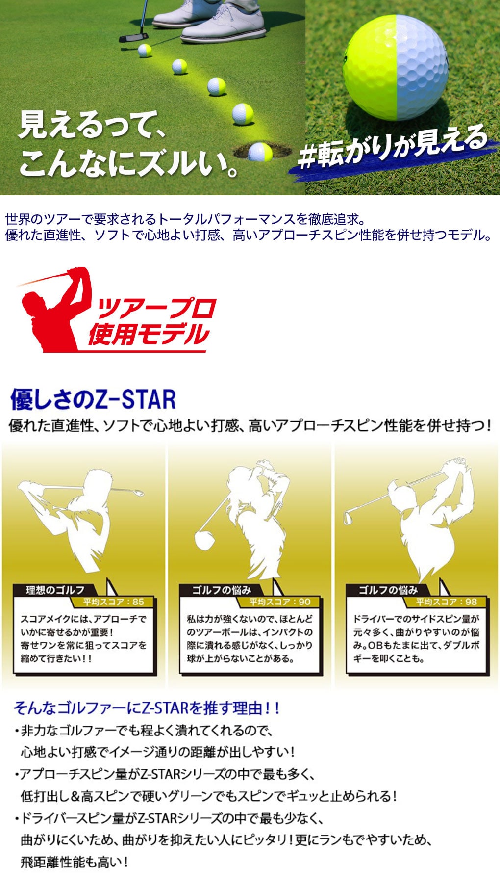 イエローとホワイトで半球ずつ色分けしたボールは、2色の境目部のラインを目標に対して合わせやすいほか、飛球中のボールの回転が分かりやすく、ボールのスピン回転がハッキリ見えることが特長です。グリーン上での転がりも見えやすいので、普段ゴルフボールにラインを引いている方にもおすすめです。さらに、見えやすいことでロストボールしにくく、遠くからでも自分のボールと分かりやすいため誤球防止にもなります。