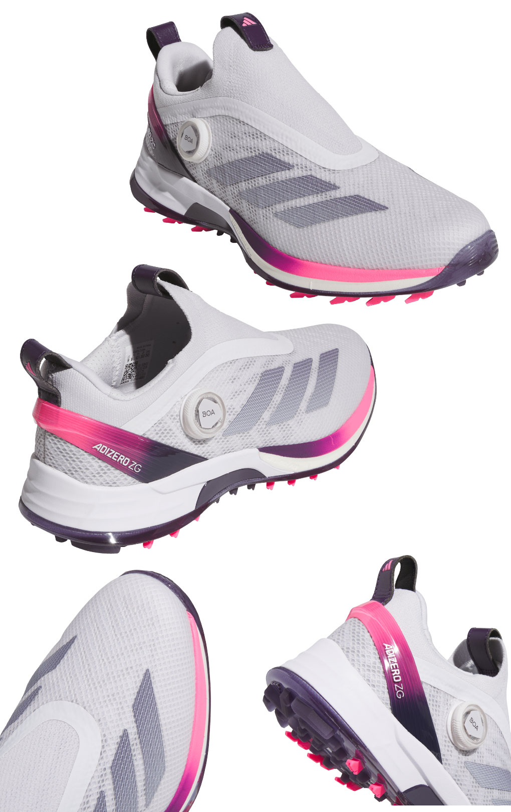 中足部アーチをホールドし、トルクコントロールをつま先までもたらすことでエネルギーロスを軽減。3本のブレードがLIGHTSTRIKE PROに接着され、相乗効果で推進力を高めることで、鋭い蹴りを可能にしながら歩行時の疲労を軽減。 ◆ スパイクモアアウトソール ◆ スパイクとスパイクレスの長所を併せ持ち、歩行時とスイング時の性能を自動的に切り替わるテクノロジーがさらに進化。屈曲する外周のアームにより、軽快な歩行と驚異的なグリップ力を両立。中心部の特殊なラグ形状でダイナミックなフットワークを高次元でサポート。◆ BOA + PRIMEKNIT ◆革新的なアッパー内蔵型のクロージャー構造のサブサーフェス直足BOAラップを搭載。高伸縮素材のPRIMEKNITが足の形状に順応し、フィット感と通気性を向上。BOAのレースとパネルも内蔵され、ブレを抑えてアグレッシブなスイングをサポート。BOAパネルにもシークエンスレーシングとTRI-WRAP構造を採用し、安定性と順応性が大きく向上。