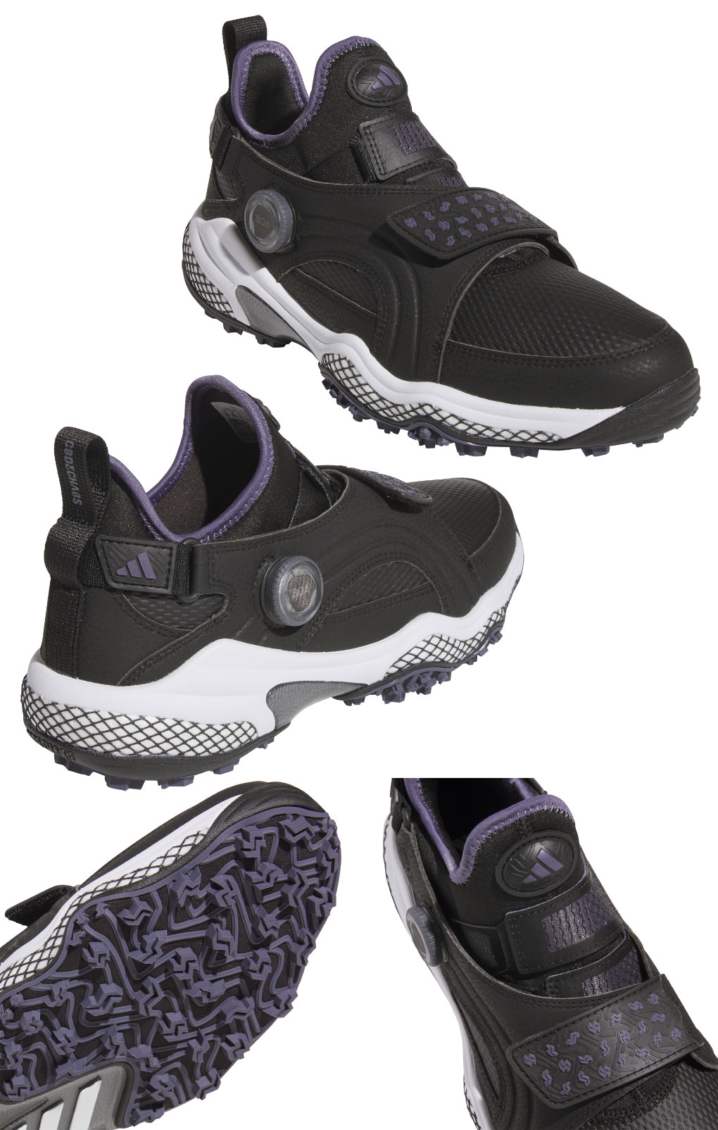 シルエットは通常モデルよりも高いカットが特徴的なトレーナースタイルとなっており、スポーティーでユニークなデザインを採用しています。防水性と安定性の高いテキスタイルアッパーを採用しつつ、直足BOAラップに加えてシューズの横と縦方向を360°ホールドする面ファスナーの外部ケージによってしっかりとした安定性を可能にしています。ケージのストラップがTWISTGRIPのデザインをあしらった面ファスナークロージャーになっており、最も膨張とブレが発生する前足部をしっかりと締め上げることでよりパワフルなスイングを可能にします。横方向から踵周りにかけても同様に、このケージがしっかりとサポートしていることで横方向への高い安定性をもたらします。コードカオス25 MID BOAは通常のBOAモデルより、更にしっかりとした安定性を求めるゴルファーにおすすめの一足です。