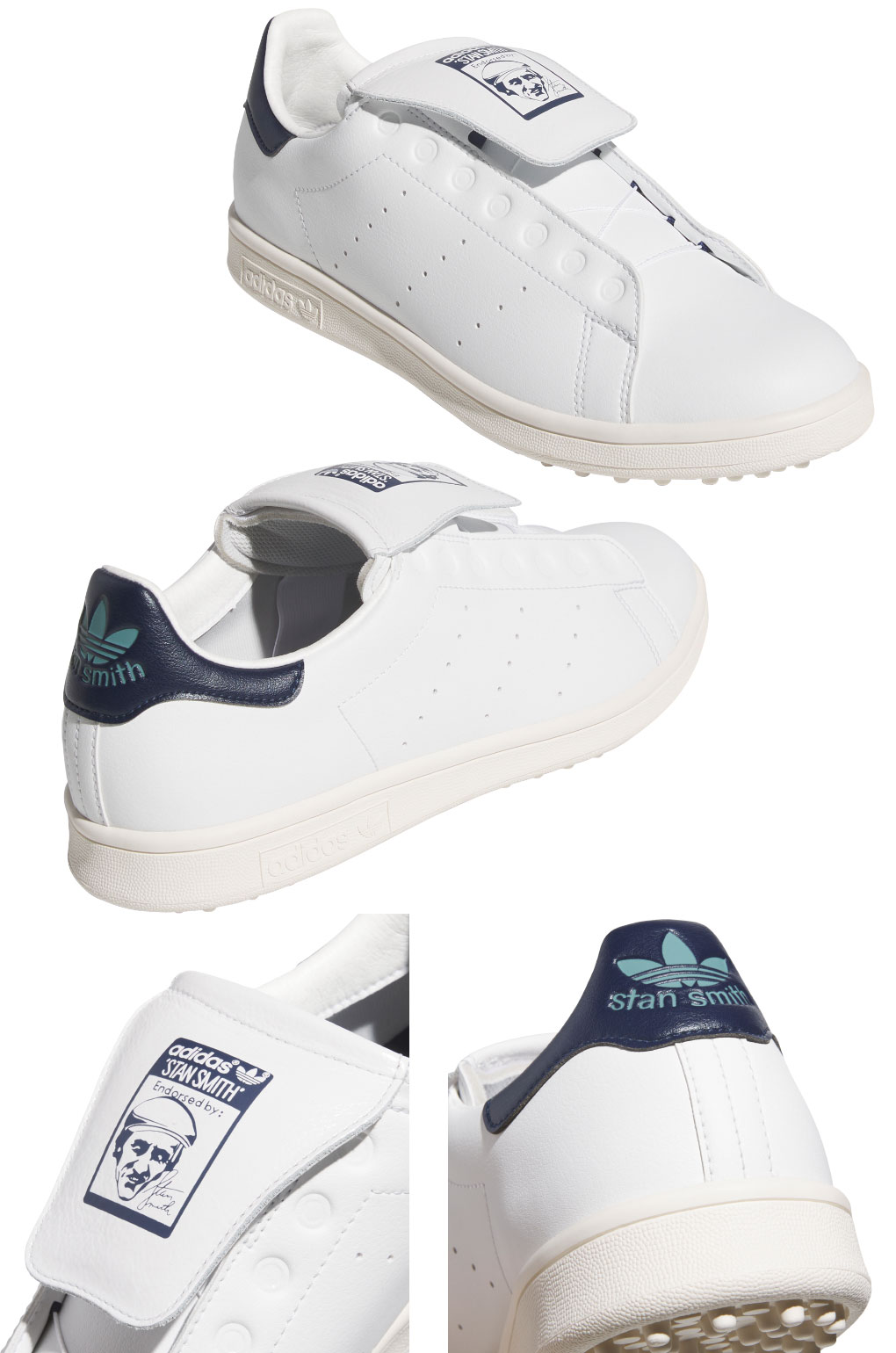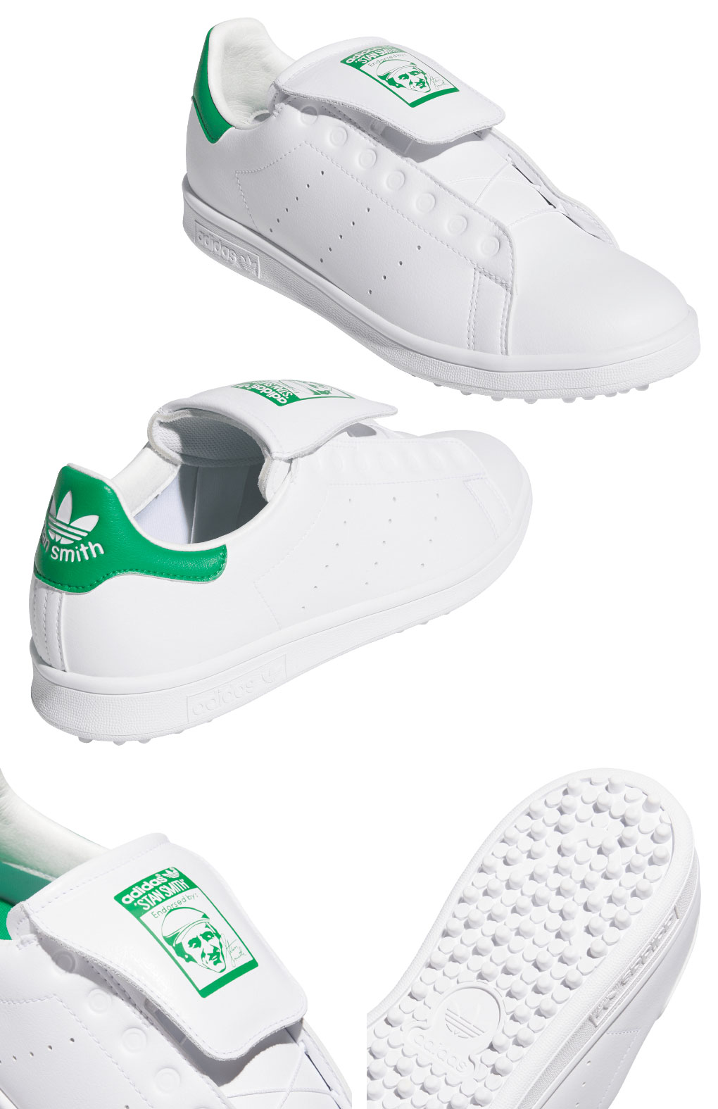 オリジナルズのシューズとしては初のBOA搭載モデルとなっていながら、アイコニックなスタンスミスのシルエットやデザインに新たなユニークさをあしらったものに仕上がっています。通常のスタンスミスにはない、防水の合成皮革アッパー・芝生でしっかりとグリップ力を生むスパイクレスラバーアウトソール・よりクッション性を高めたミッドソールの内部構造はシューレースモデルと同様にゴルフのために作られた仕様になっています。それに今回はBOA クロージャーを搭載しました。中足部のアッパーを全面的に引っ張ることで、おしゃれで汎用性の高いデザインを干渉せずゴルフに必要な安定性をもたらします。特徴的なのが天然皮革素材を使ったモールドシュータンです。スタンスミスのロゴを前面的に表現しながらタンから手を離せば自動的にBOAのダイヤルを隠してくれる特殊な構造により、クリーンなデザインを実現しています。