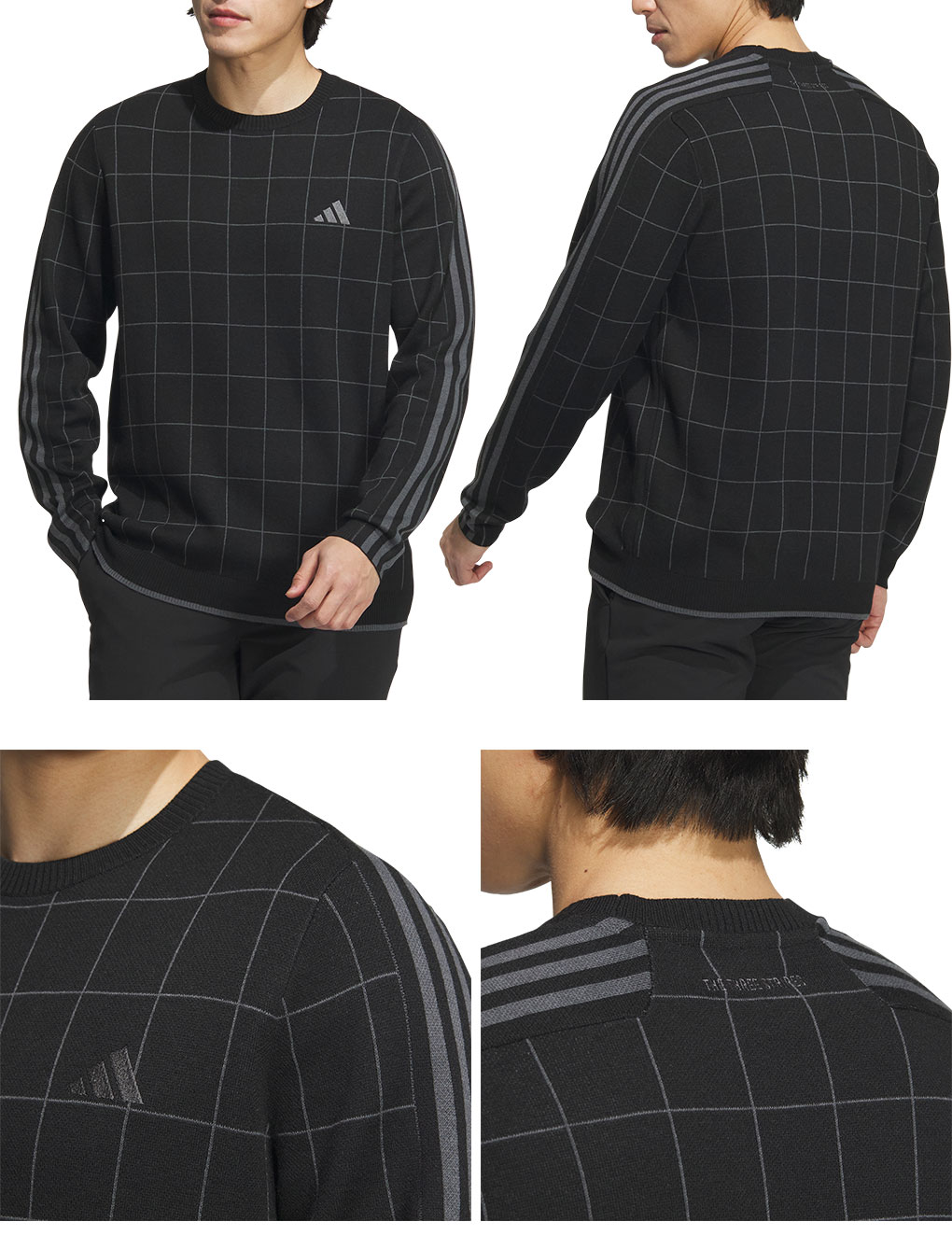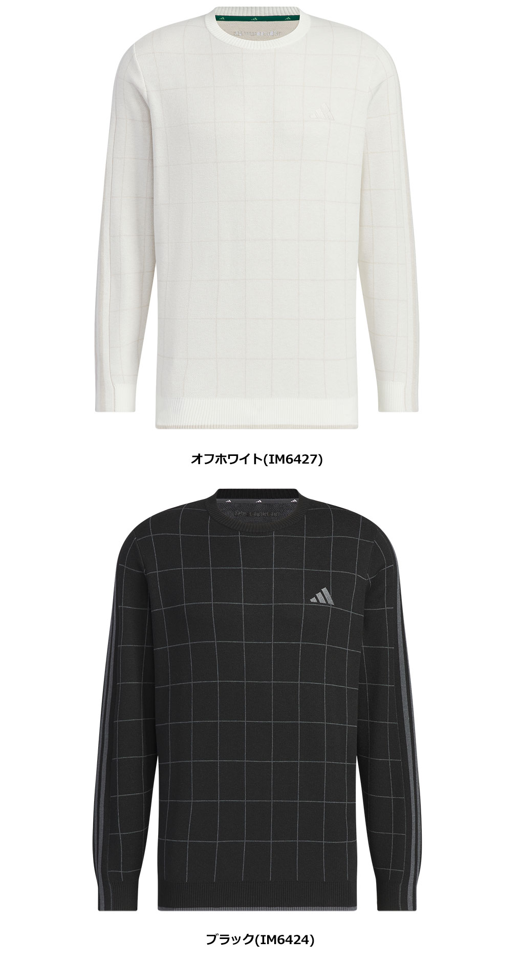 ベーシックなデザインのチェック柄セーター。袖にはスリーストライプを施したアイコニックなアイテムです。
