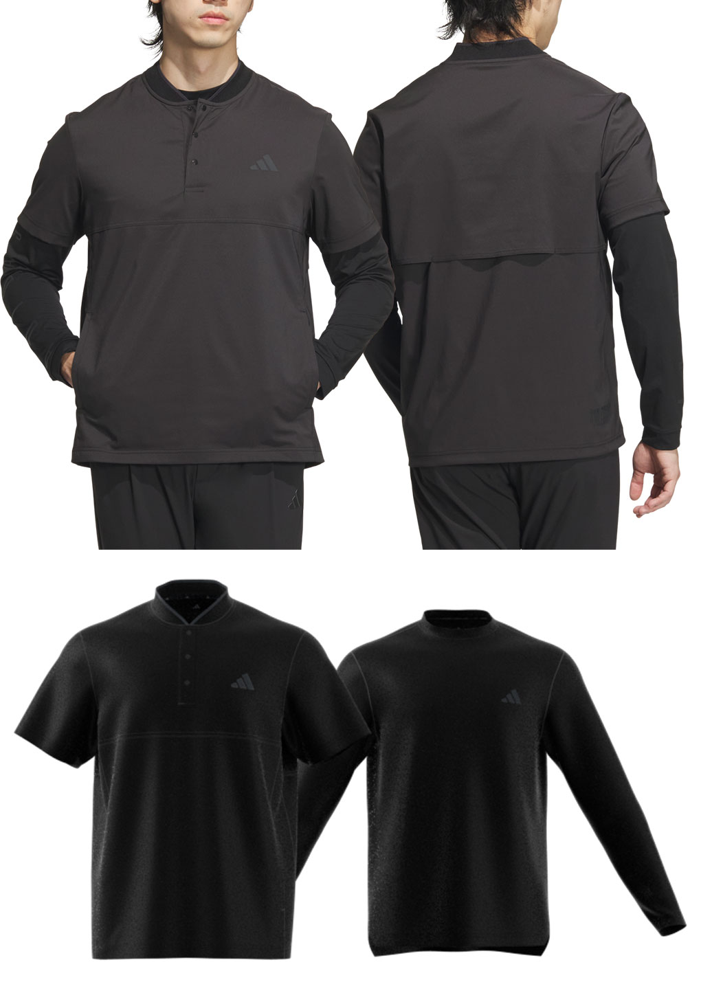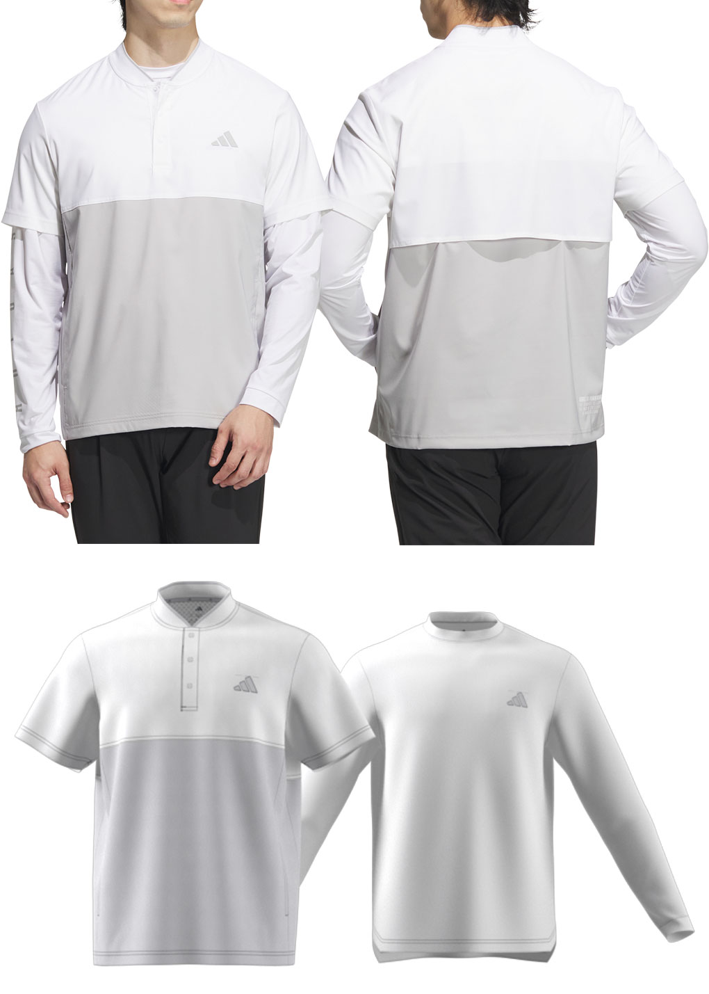 モックネックの半袖ジップシャツと長袖シャツのレイヤードスタイル。ワーディングデザインアクセントになっている長袖シャツは一枚でも着用可能です。