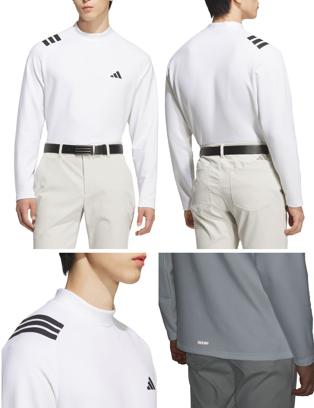 保温性の高いCOLD.RDY素材を使用したモックネックシャツ。肩にデザインされた大胆なスリーストライプが特徴的なアイテム。