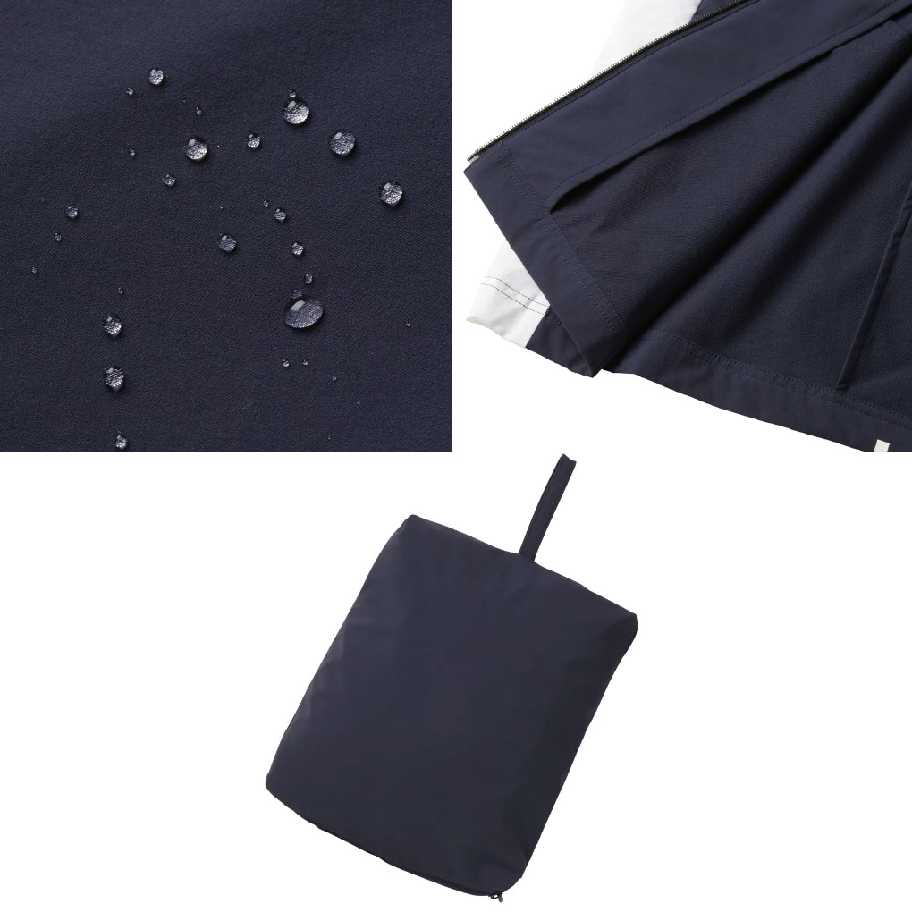 パッカブル仕様で、ゴルファーの動きを妨げないデザインと、変わりやすい天候に対応するための保温性、撥水性のある素材を採用。