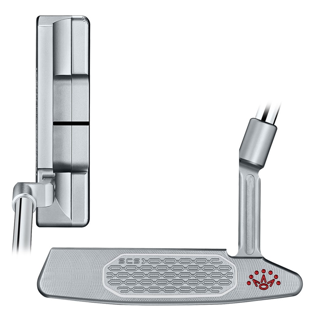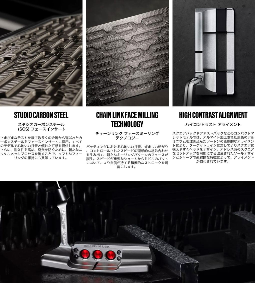 スコッティ・キャメロンパターを象徴する形状が、洗練されたシャープな輪郭、SCSフェースインサート、チェーンリンク フェースミーリング、やや厚めのトップラインを備え次の時代へ。タングステンのソールウェイト、洗練されたトライソールデザイン、アイビームプラミングネックを採用しています。