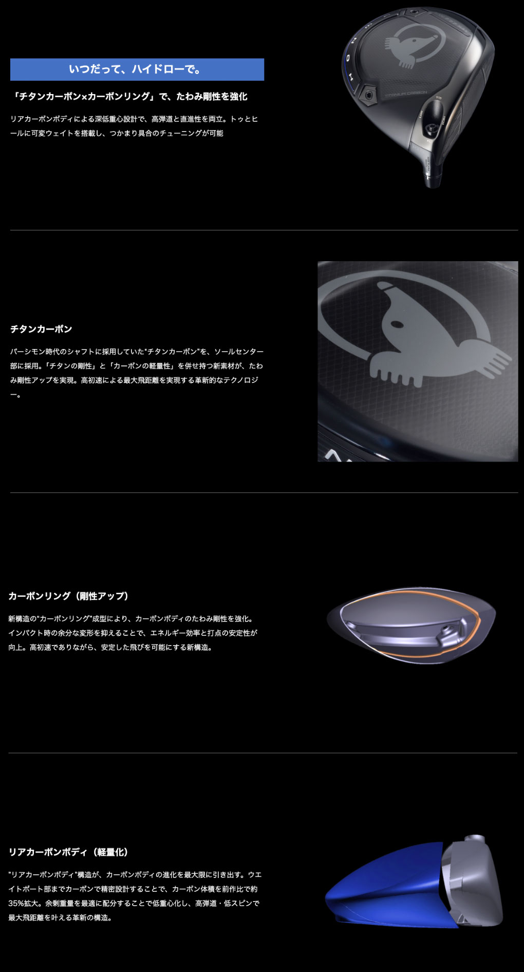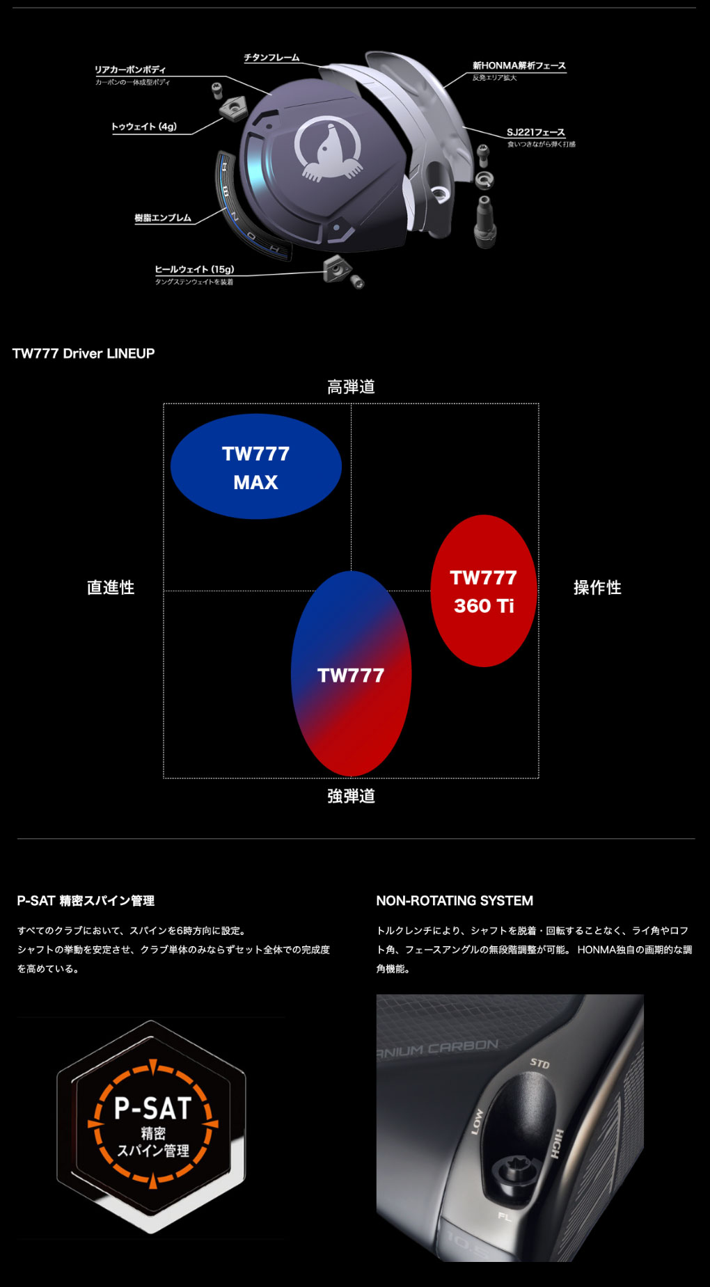 | ヘッド素材/製法 | Ti811ボディ/ 鋳造+カーボン+タングステンウエイト+アルミ+SJ221チタンフェース /鍛造 | |