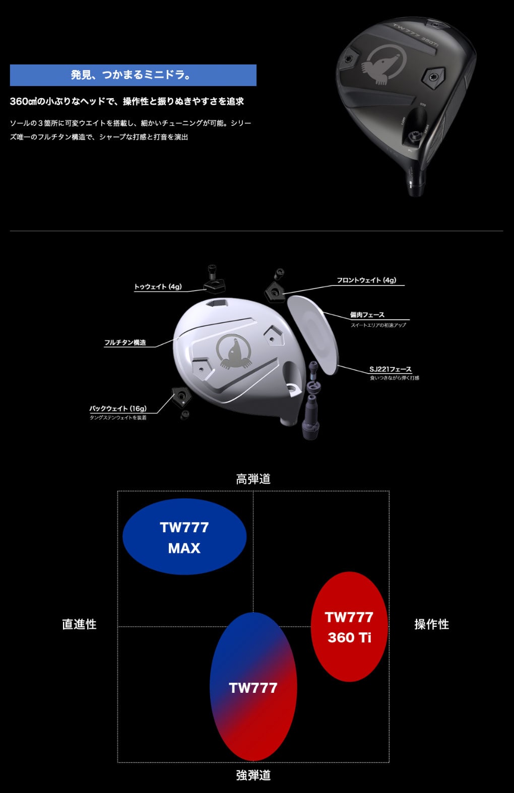 | ヘッド素材/製法 | Ti811ボディ/ 鋳造+タングステンウエイト+アルミ+SJ221チタンフェース開口圧延 |