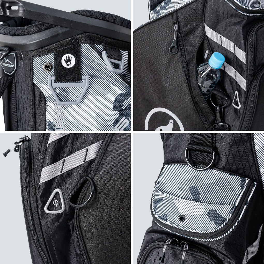 ボトルポケット、グローブホルダー、マグネットポケットなどの機能搭載のスタンドバッグ。
