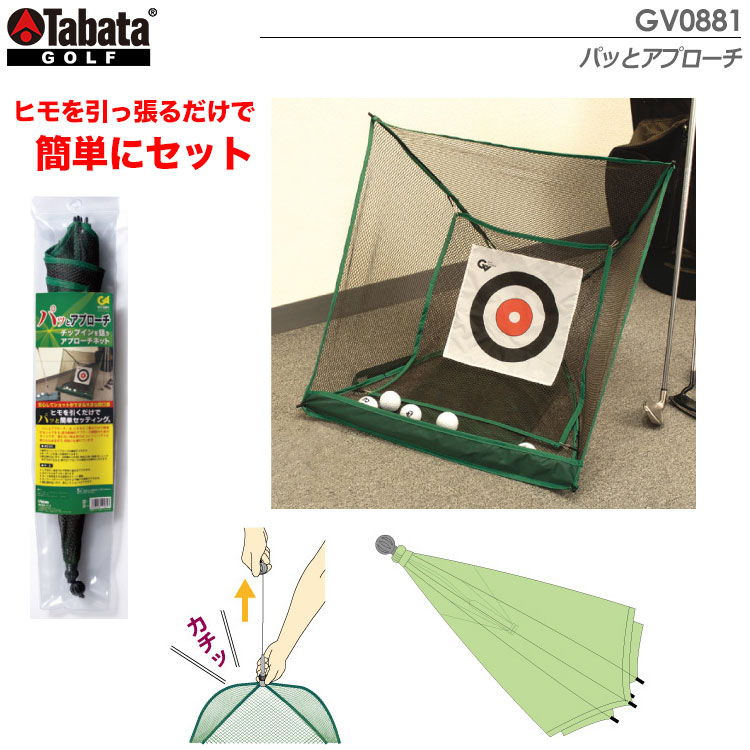 ヒモを引くと傘のようにネットが広がります室内専用のアプローチ専用ネット。
