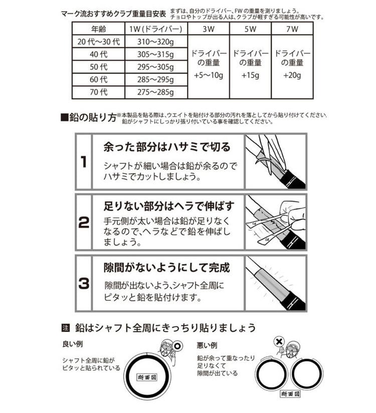 シャフトに鉛を貼る事でクラブのバランスを変えずに総重量をアップさせ、