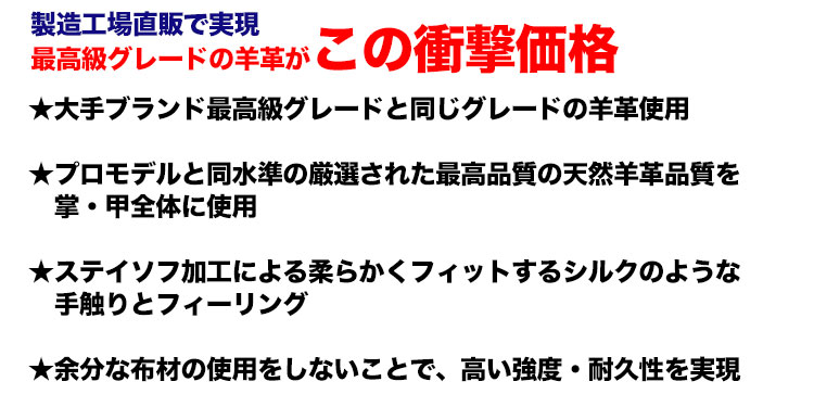 ただ最高品質の天然羊革を、掌・甲全てに使用。