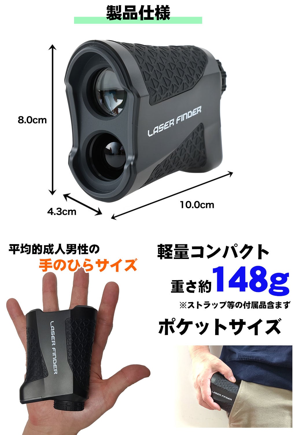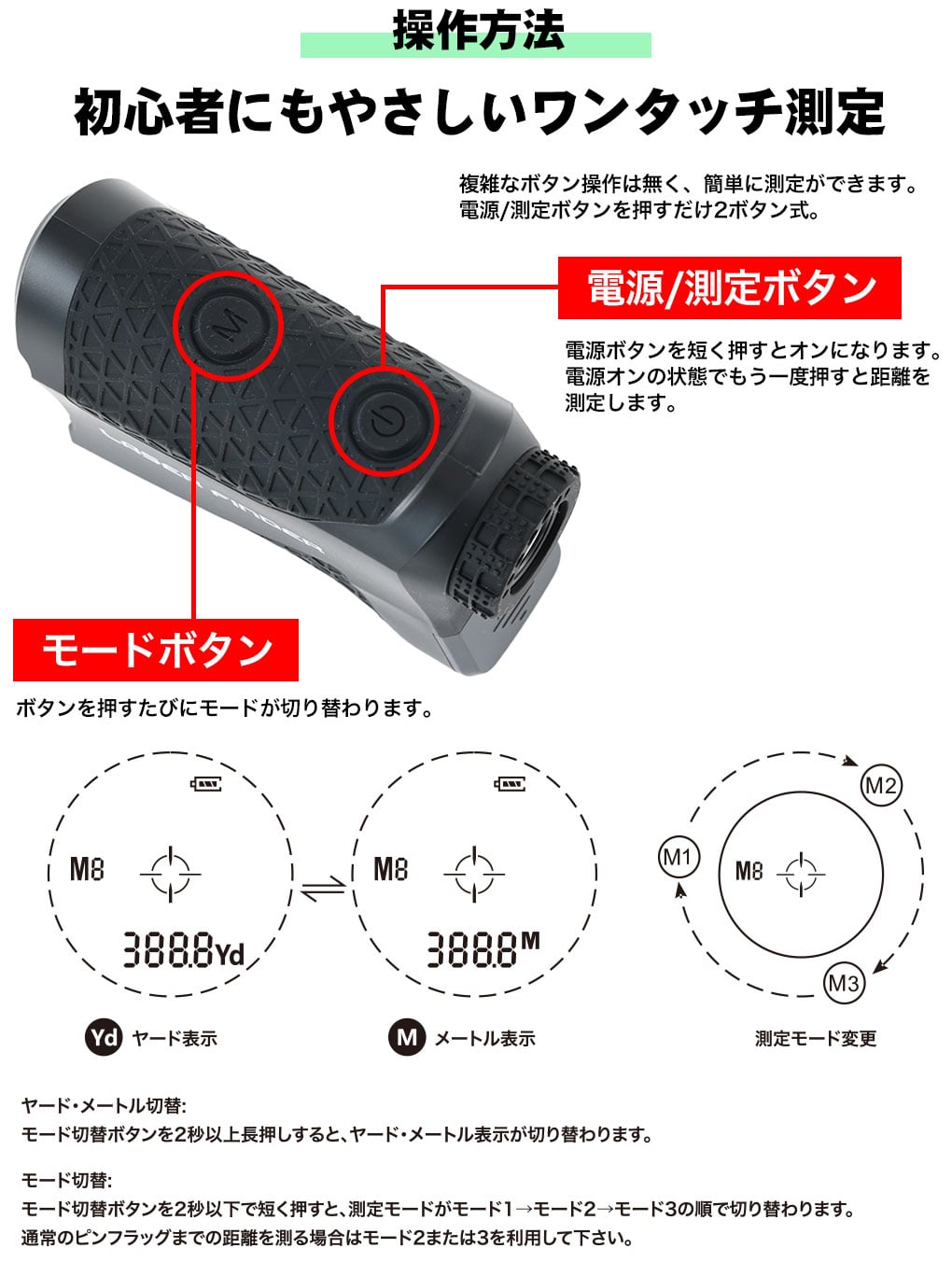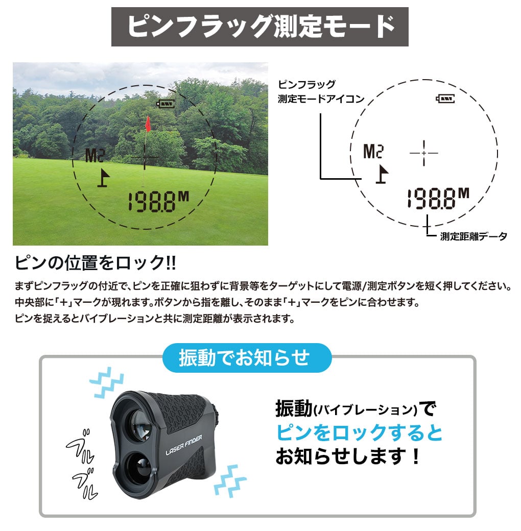 ・ターゲットをとらえるとバイブレーションでお知らせ、連続サーチ測定モードも搭載