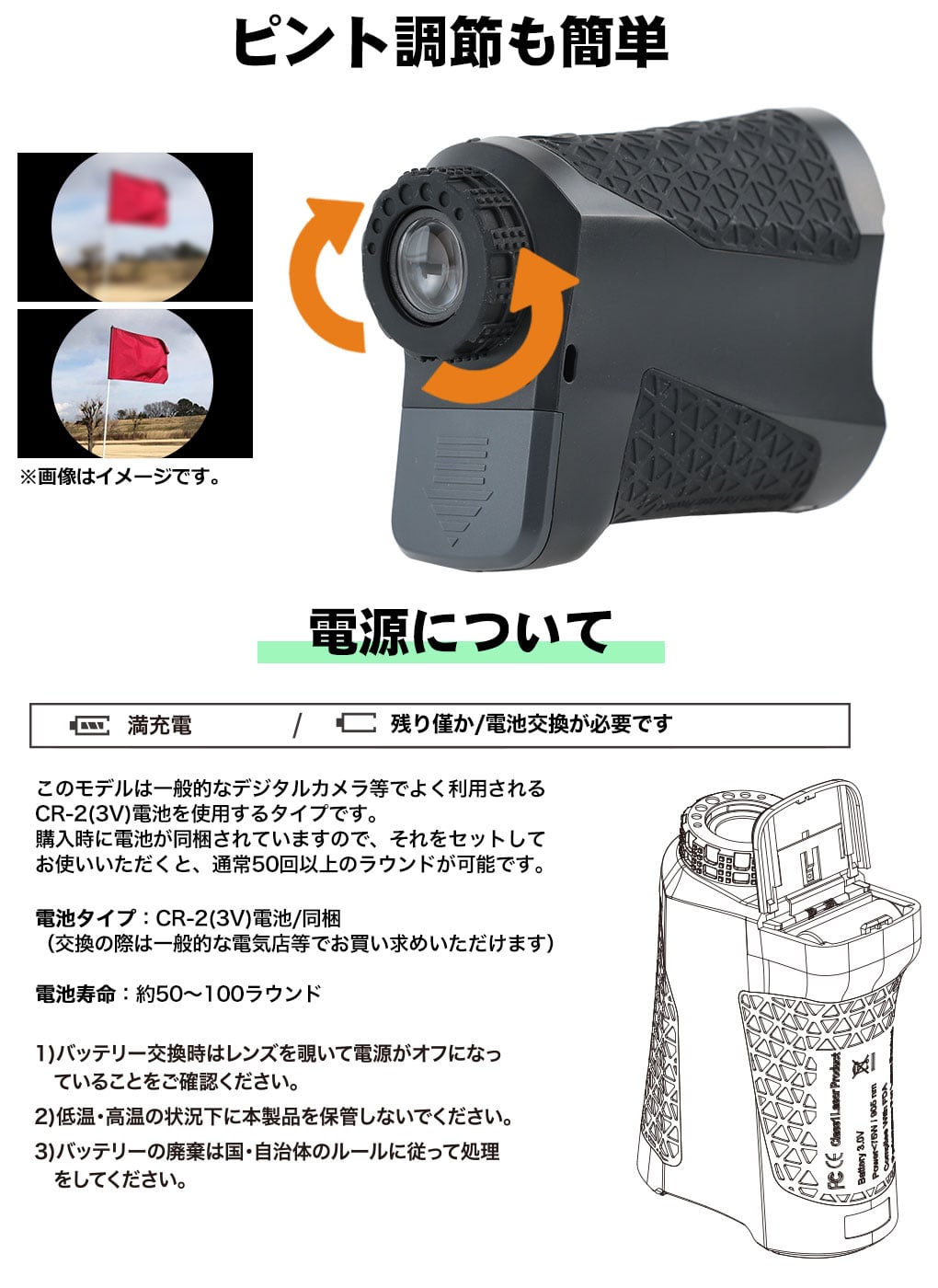 ・一般的なデジカメ等で使用されるCR-2電池タイプ。同梱の電池で50-100ラウンドが可能です。電池の取り換えは一般的な電気店等でご購入下さい。