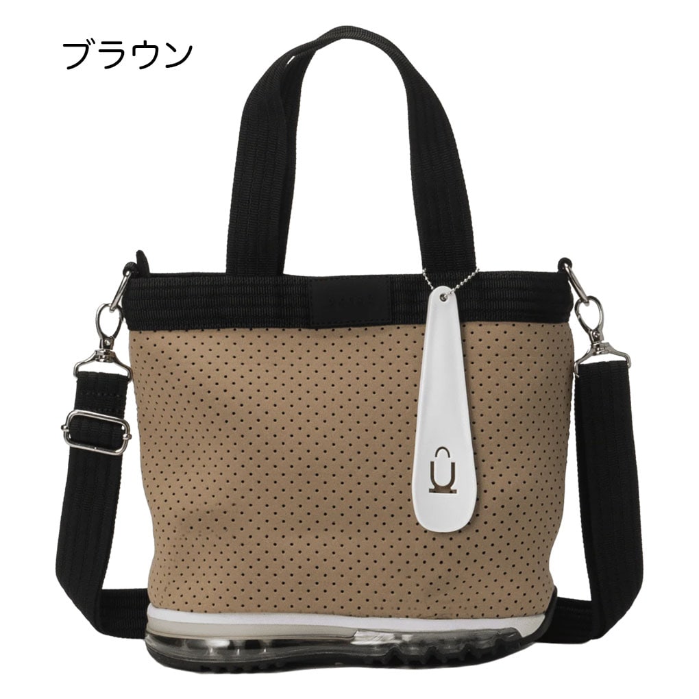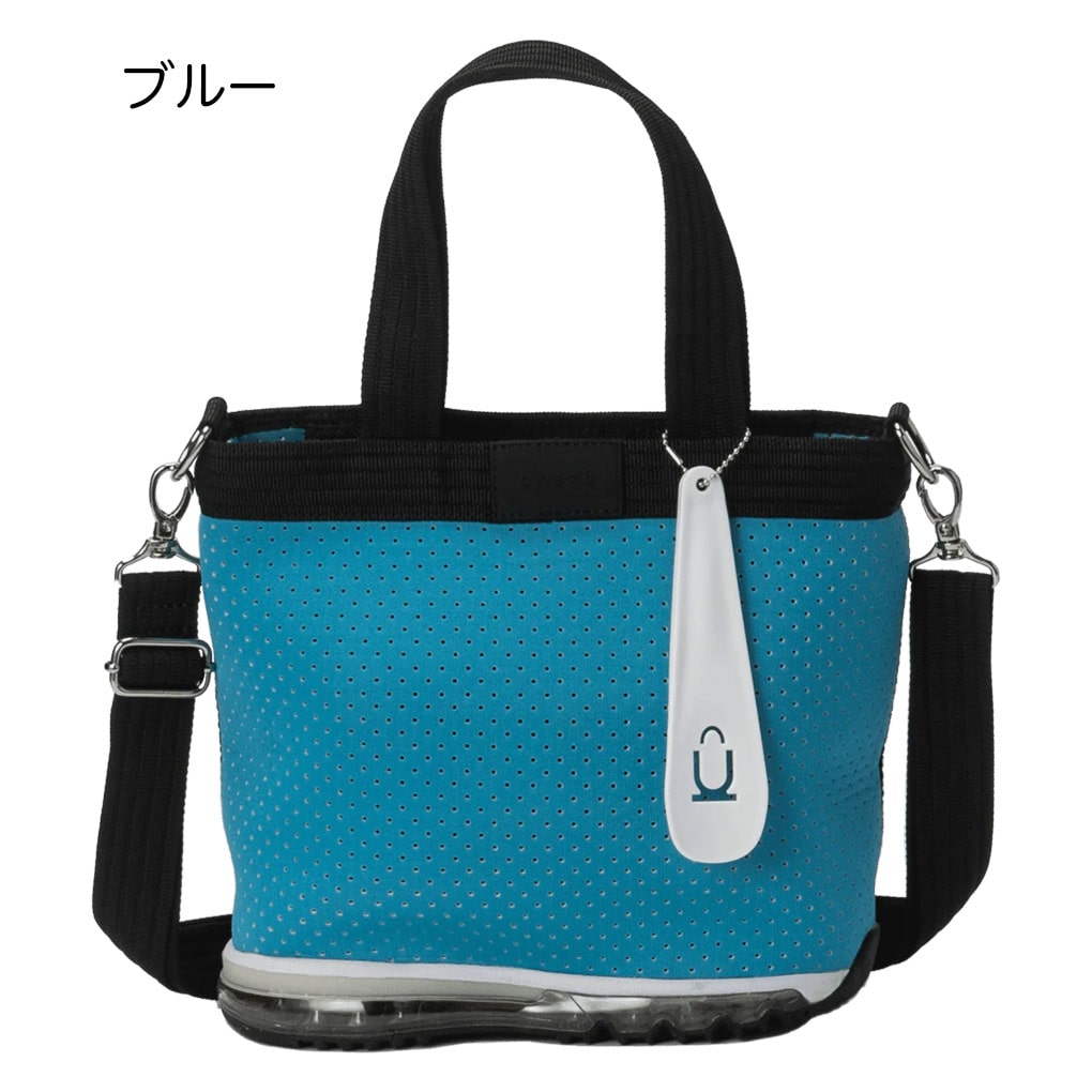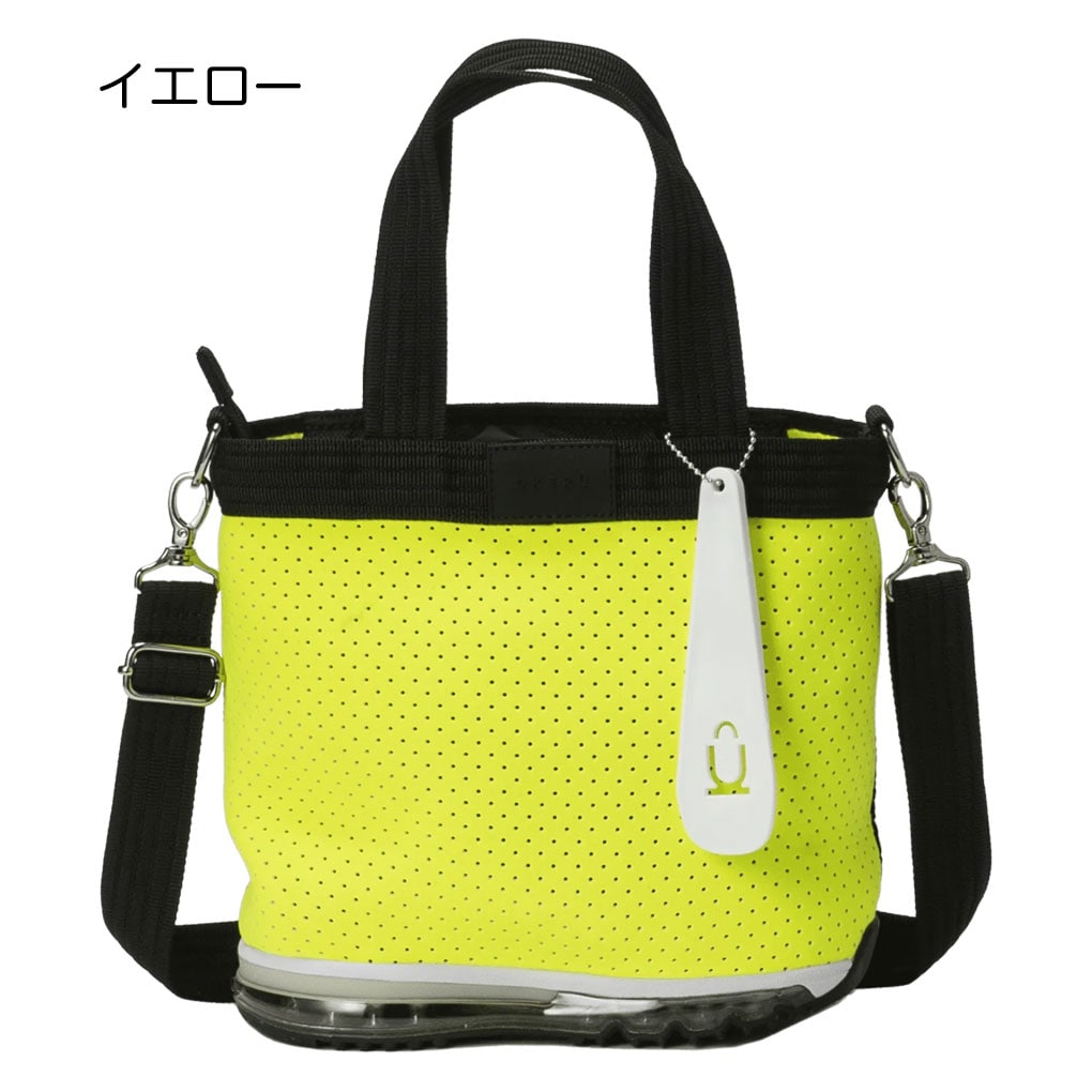 伸縮性のある丈夫なポリエステル素材と、スポーティーなエアーソールを用いた代表モデル。普段のファッションにワンポイントの遊びを加えてくれるシリーズ。天マチにはファスナーが付いてゴルフやアウトドアでのカラス対策も安心。しっかりと自立し地面や床に気兼ねなく置けるので普段使いからジムバッグ、アウトドア、ペットのお散歩など用途はさまざま。取り外し可能なショルダーストラップも付属し、コーディネートやお出掛け先によって使い方が変えられるところもうれしいポイント。