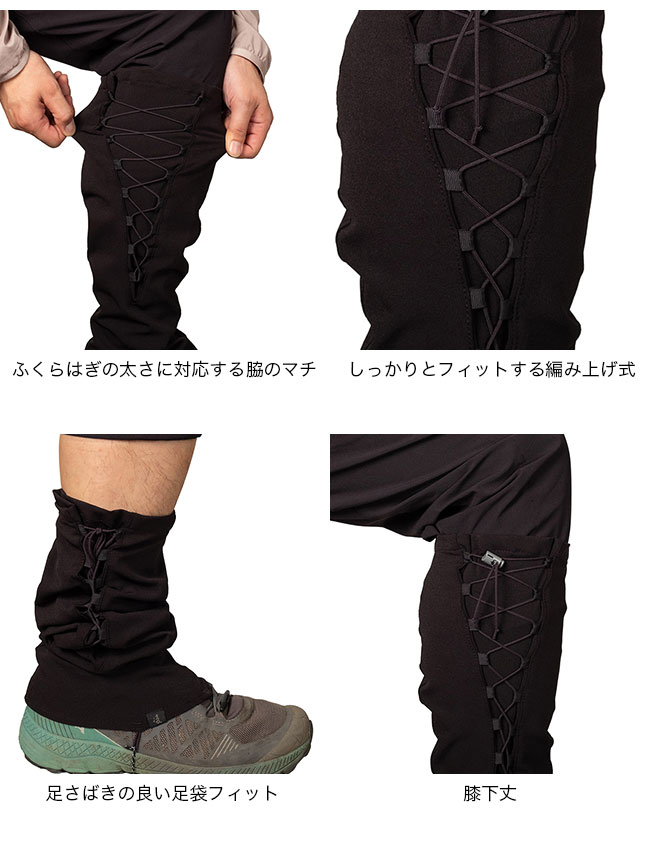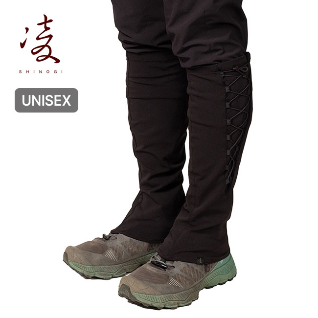 ソフトシェル素材を採用した膝下丈ゲイター「クナイ」は、踏み跡の少ない尾根や渓を歩くシノギングに最適。地下足袋を参考にした編み上げ式で、ふくらはぎにしっかりフィットし、トグルやループで簡単にシューズに固定可能です。