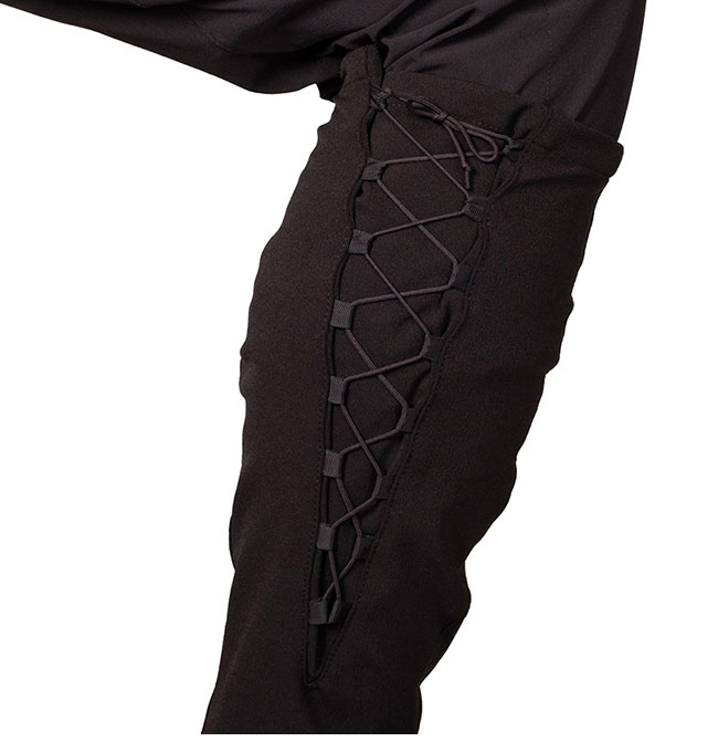 シノギングでは、晴れでも雨でも雪でも、どんな天気でもクナイを使います。もともと防水仕様のシューズを使うことが多くないので濡れることはそれほど気にならず、撥水のメンテナンスをしっかりしておけば何とか凌ぐことができるからです。裾の前のトグルをシューレースにくぐらせてから引き上げて固定します。そして裾の左右のループにバンジーコードや丈夫な細引きを付けてシューズの底に固定することで、裾まわりがシューズにしっかりフィットして、異物の侵入や裾の浮き上がりを防ぐことができます。また、かかとの裏面の面ファスナー(ループ)によって一部のシューズに容易に固定することができます。編み上げの細引きは編み目が見るくらいのゆとりを持たせて、穿き口の内側で一度交差させてから外側に戻して結んでください。こうすることですり落ちてくることがなく、編み上げの模様をきれいに見せることができます。