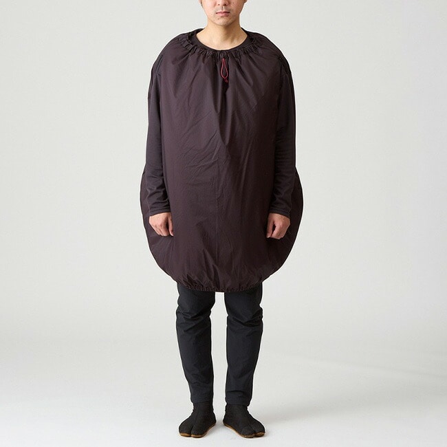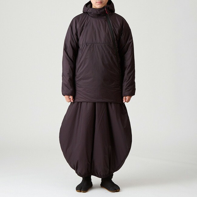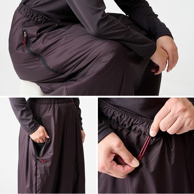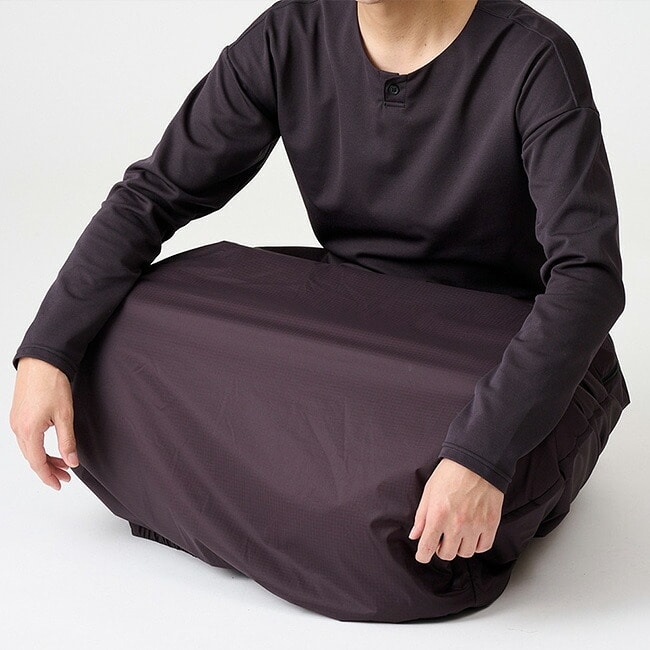 な、なにこれ?とインパクトの強い樽型のシェイプは、あぐらをかいても膝が突っ張ることなく中綿をしっかり膨らませるためのもので、日帰りシノギングの休憩やお泊りシノギングのリラックスタイムを暖かく過ごせるユニークなスカートです。座った時にずり落ちて寒くないように腰周りを深くしてあり、両脇のスルーポケットは下に穿いたパンツのポケットにアクセスできる他にハンドウォーマーとしても有効です。ダウンパンツは座って使うことが多いのに膝と腰が突っ張ってせっかくのダウンがつぶれてしまい、そこだけ寒く感じることも少なくありませんが、アグラスカートは座った状態でも立った状態でも足腰をしっかり温めます。