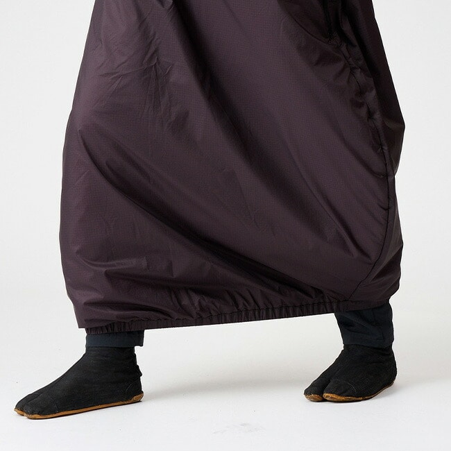 アグラスカートはハンモックポイントでの停滞時に使用することを想定しており、ハンモックのまわりを歩いたりトイレに行ったりする程度の歩きを想定したデザインになっています。ハイキングコースでは歩幅が十分に取れなかったり、段差に引っ掛けたりして危険ですので使用しないでください。通気性の高い裏地を使用しているため、わずかに中綿が出てくることがあります。