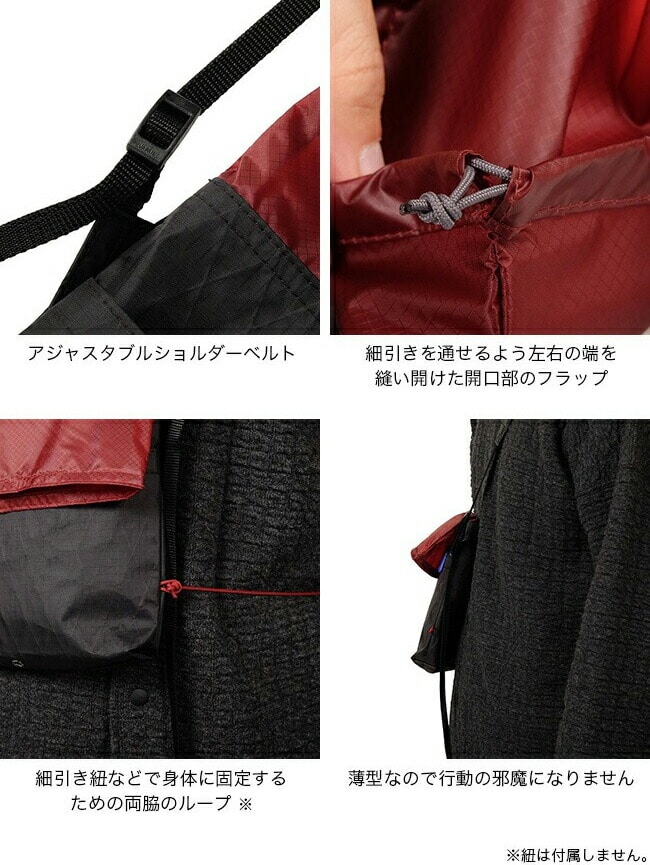 それでも開口部を絞りたいという人のために、口布上部の左右を縫い開けあるので、お好みに応じて細引きとコードロックを追加して閉じることができます。