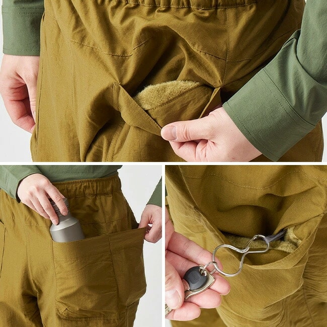 大き目のサイドポケットは二つに仕切られているので手袋や手拭い、登山地図や行動食を上手に収納でき、手を下ろした位置にちょうど良く配置されているので自然な動作でアクセスすることができます。