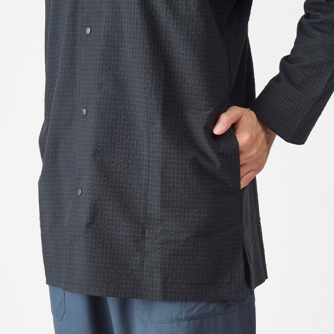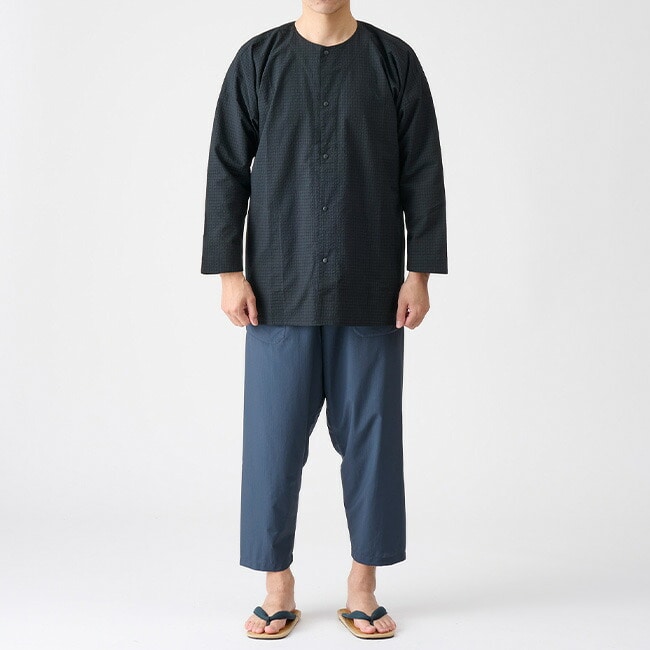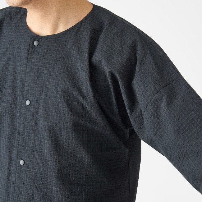 前開きには信頼のYKK Plancerスナップボタンを採用し、生地には涼しくて汗を吸ってくれるしじら織りを選びました。