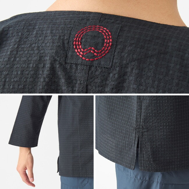 しじら織り素材が高い通気性と吸汗性を発揮し、汗をかいてもドライで快適な着心地を保ちます。ラウンドネックや着物スリーブ、縫い目のない肩まわりで動きやすく、八分袖や裾スリットが軽やかな印象をプラス。