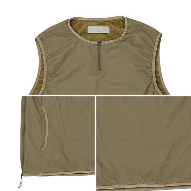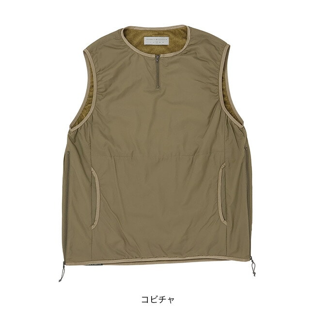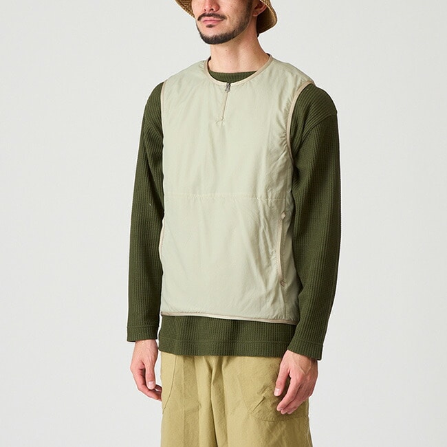 見た目はシンプルなラウンドネックのベストですが、非常に通気度の高いシェルにほどほどの保温性の帝人Octaをライニングした、軽くてふわふわのアクティブインサレーションベストです。寒い時期の峠道では適度な保温性を提供しつつも汗を放出するアクティブインサレーションとして、暖かい時期の古道歩きでは停滞時の汗冷えを防止するインサレーションとして有効で、バックパックの隙間に滑り込ませておけば一年中何かと使えます。