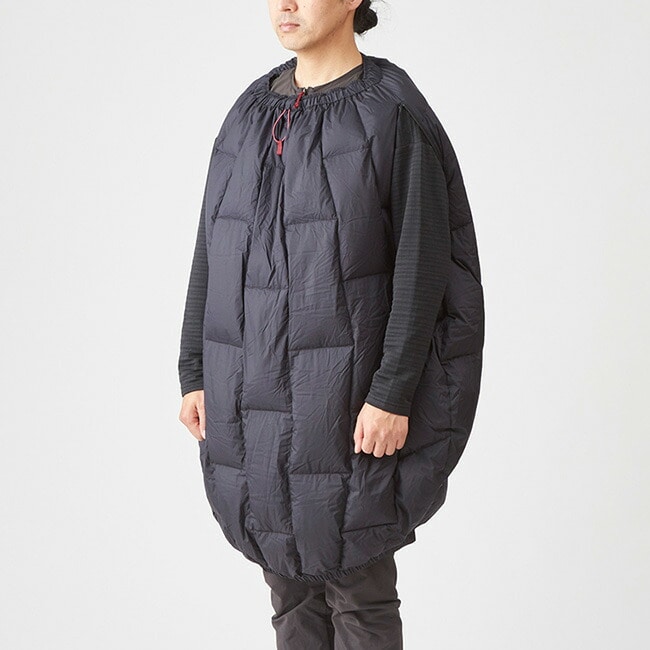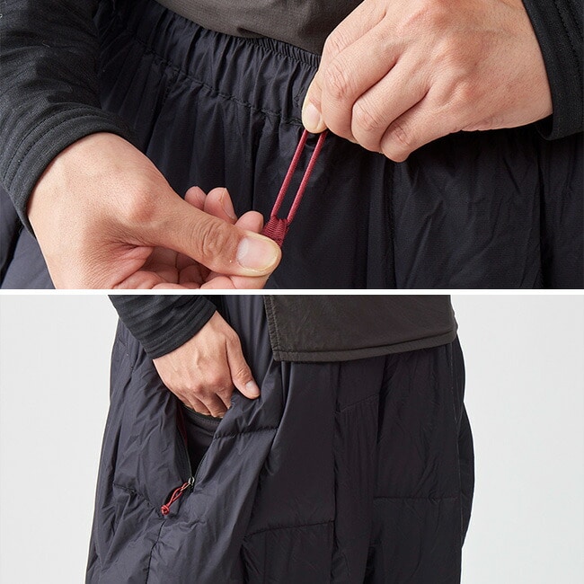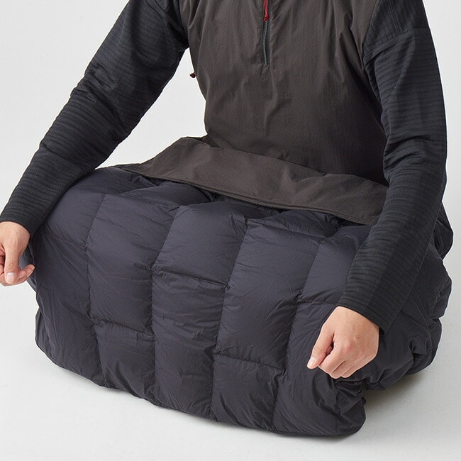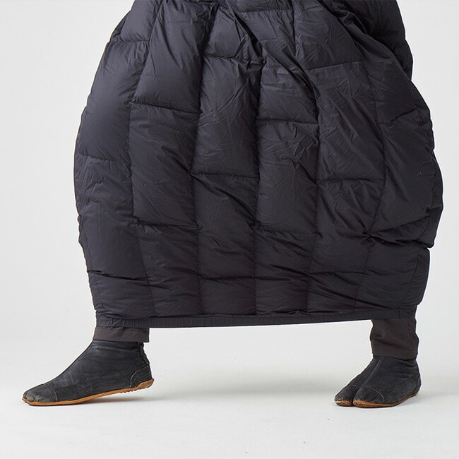 ダウンのふくらみによって見た目よりも軽い着心地を実感できます。アグラスカートを穿いてしばらくすると体温によってスカートの中の空気が温められます。この温められた空気が独特の樽型のシェイプのおかげで外に漏れ出すことなくスカートの中に閉じ込められるので想像以上のあたたかさを提供します。ベストとして着ると身頃から腰回りまでがすっぽり覆われるので体全体が温まります。