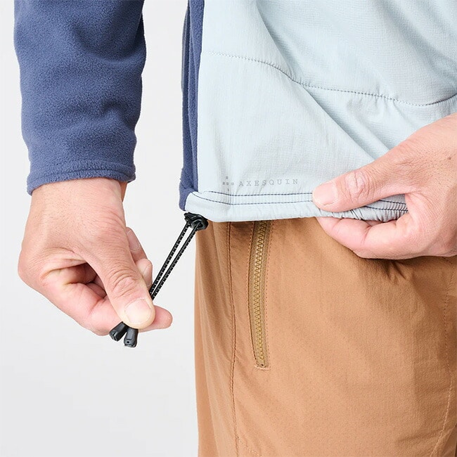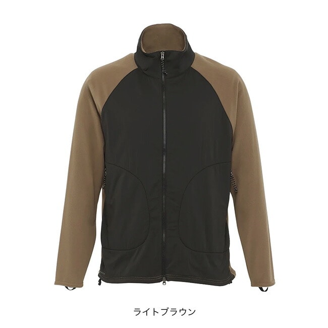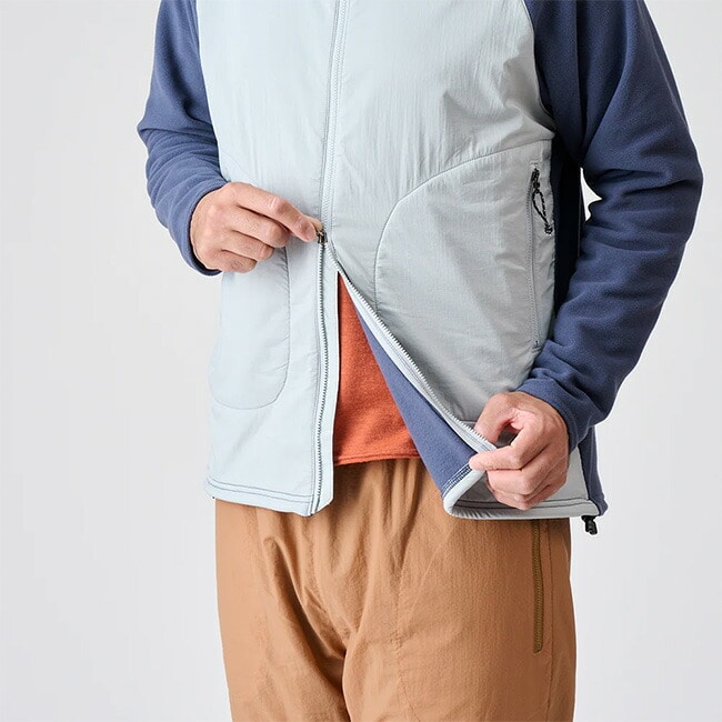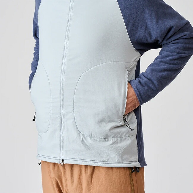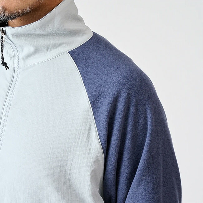 薄手でちょうどいい保温性のフリースジャケットの衿と前身頃だけに風を和らげる高通気シェルをレイヤードしたアクティブシェルです。